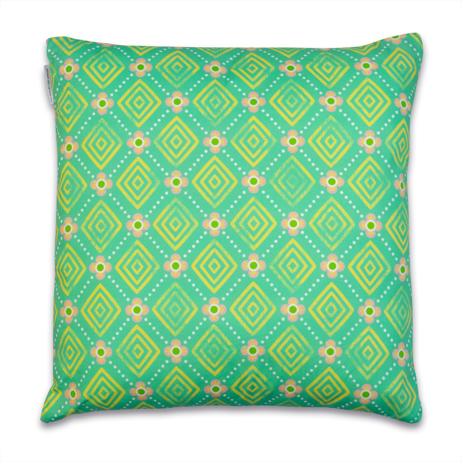 Der Bordürenstoff in Gelbtönen wurde mit "Mintfarbenen Rauten" auf der Rückseite. Achtung: Aufgrund des Musterverlaufs kann jedes Kissen anders sein!