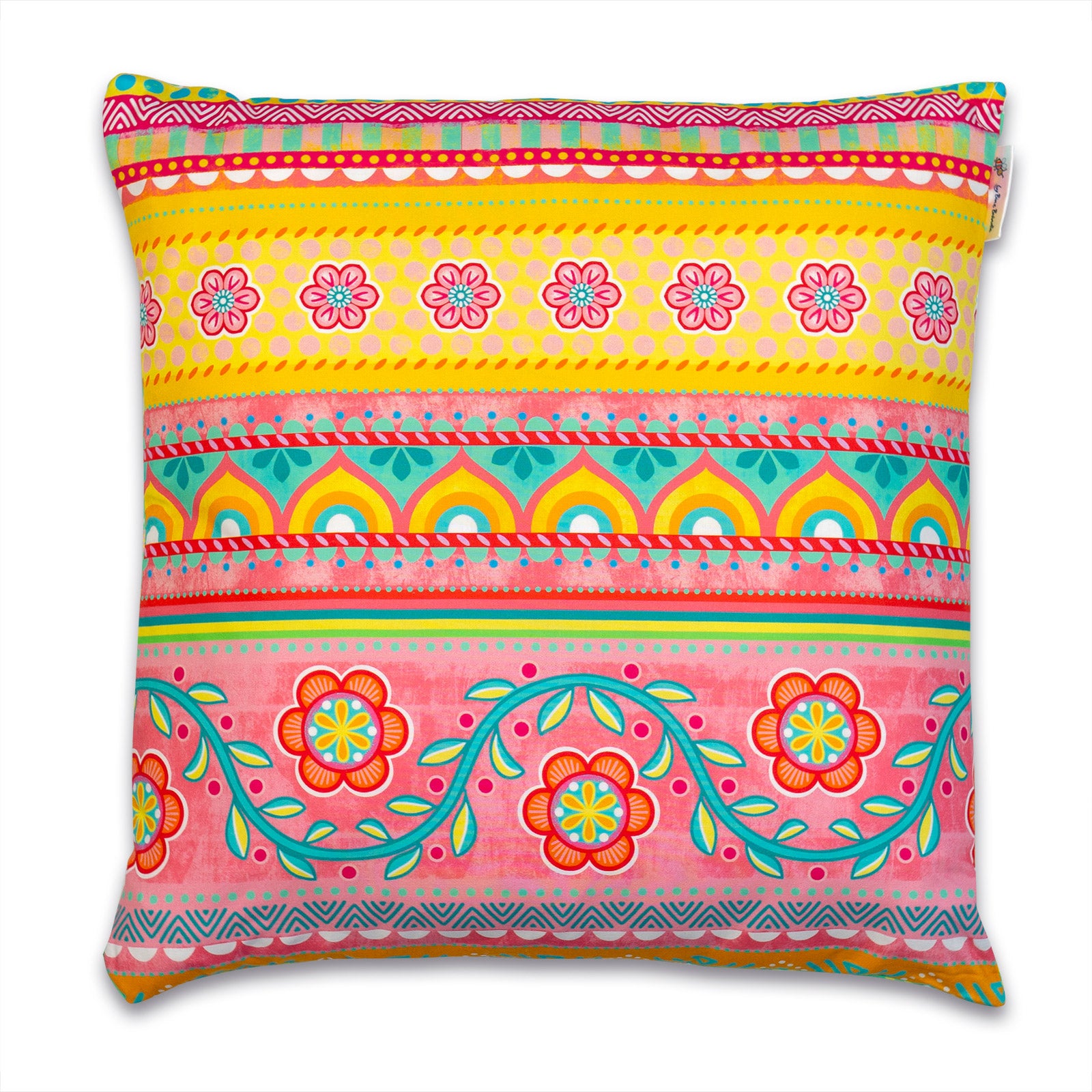 Die Dekokissen sind in unterschiedlichen Größen und Motiven erhältlich, kombiniert mit Biesen, Bommeln/ Pompoms und Quasten im Boho-Style. Dank der unterschiedlichen Rückseiten kann die Ansicht ständig gewechselt werden. Mixen Sie wild durcheinander! Je mehr Farben und Designs, umso besser, denn alles passt zusammen.