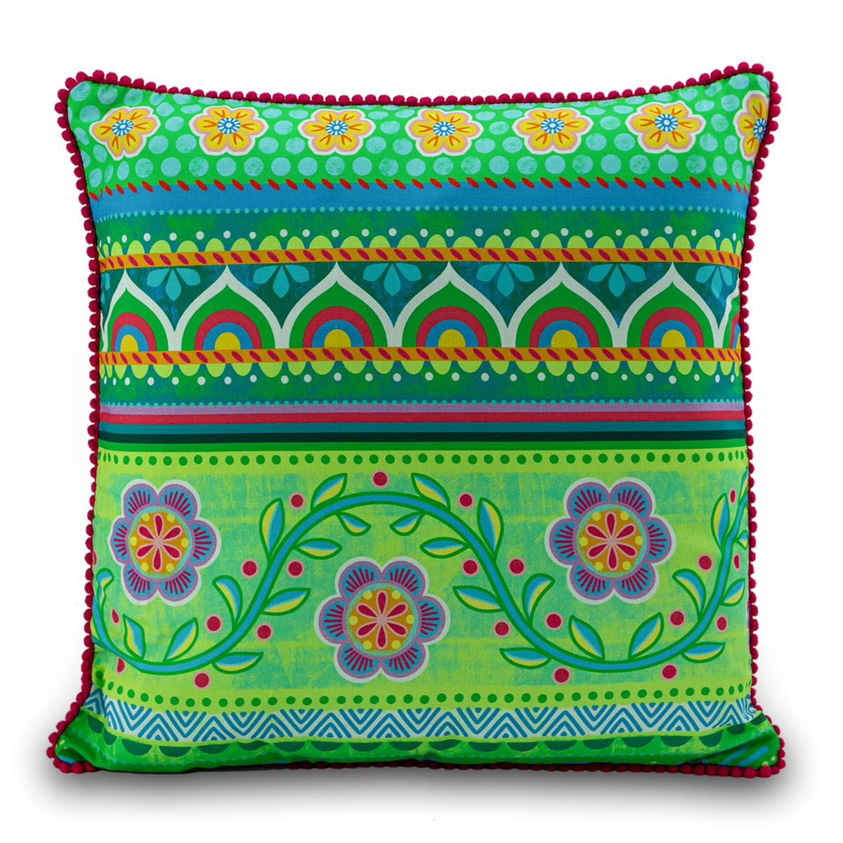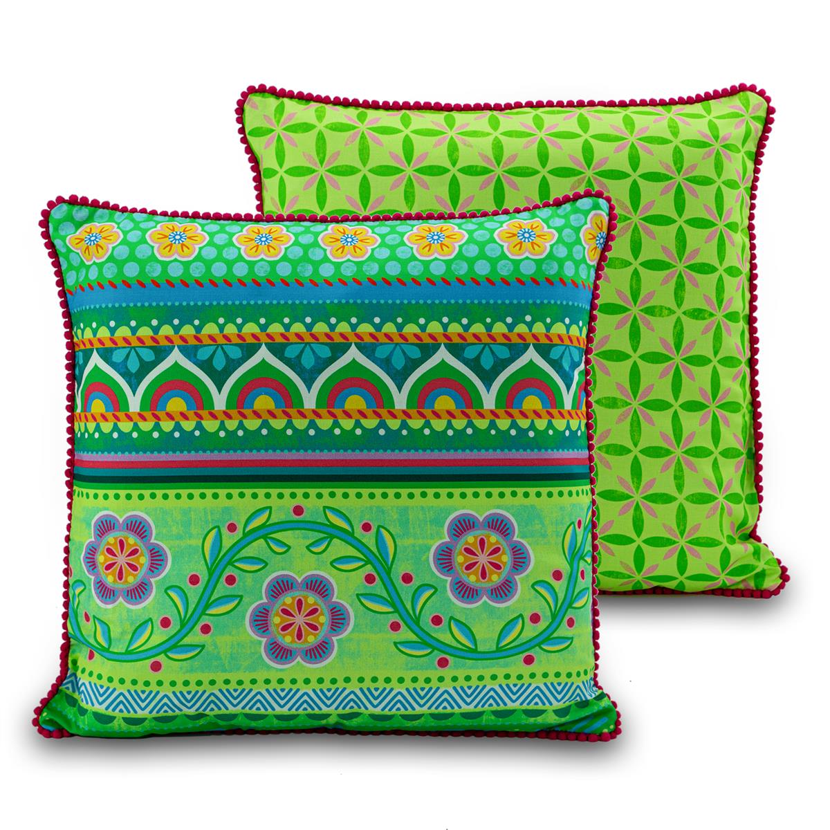 Die Dekokissen sind in unterschiedlichen Größen und Motiven erhältlich, kombiniert mit Biesen, Bommeln/ Pompoms und Quasten im Boho-Style. Dank der unterschiedlichen Rückseiten kann die Ansicht ständig gewechselt werden. Mixen Sie wild durcheinander! Je mehr Farben und Designs, umso besser, denn alles passt zusammen.