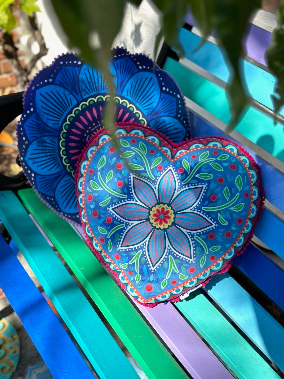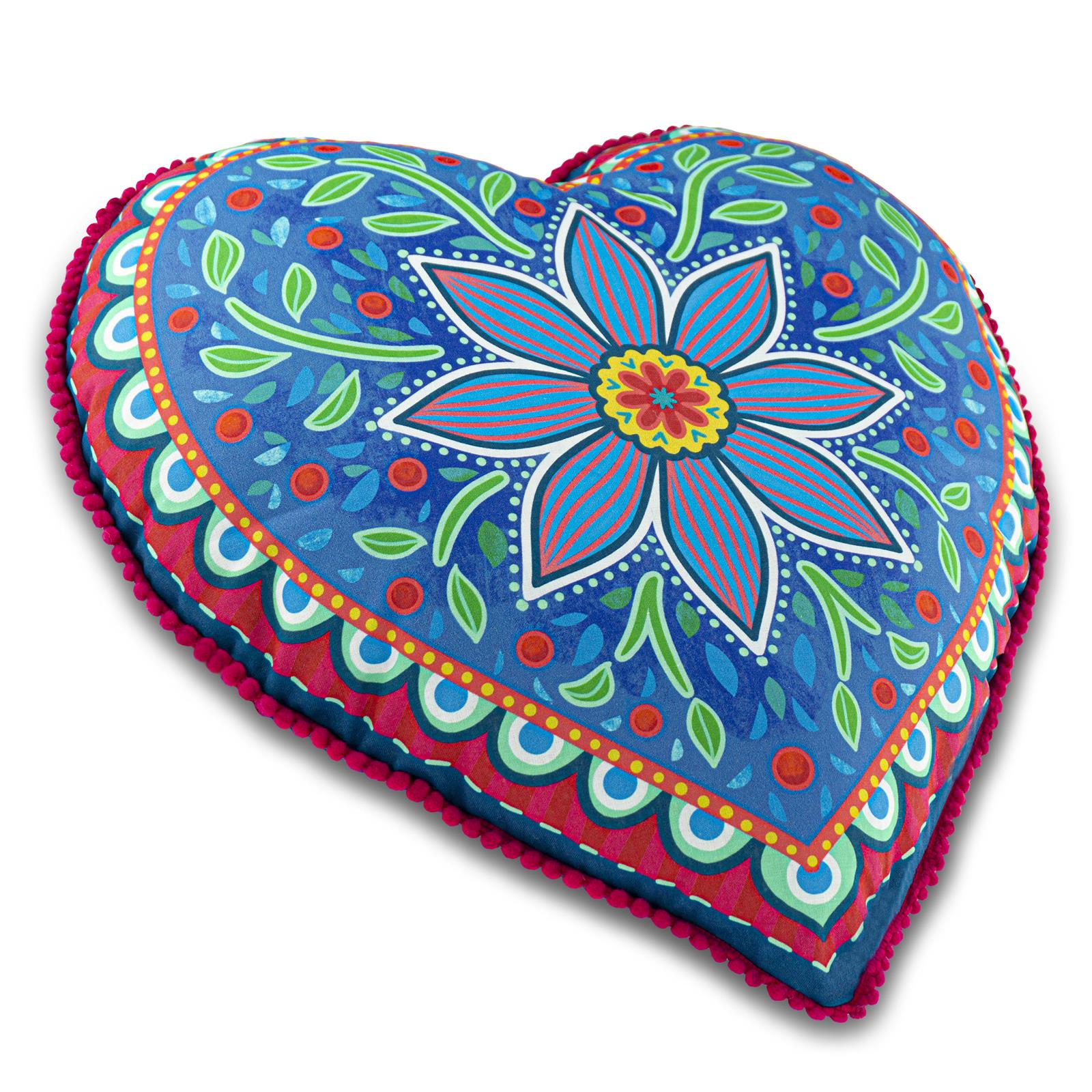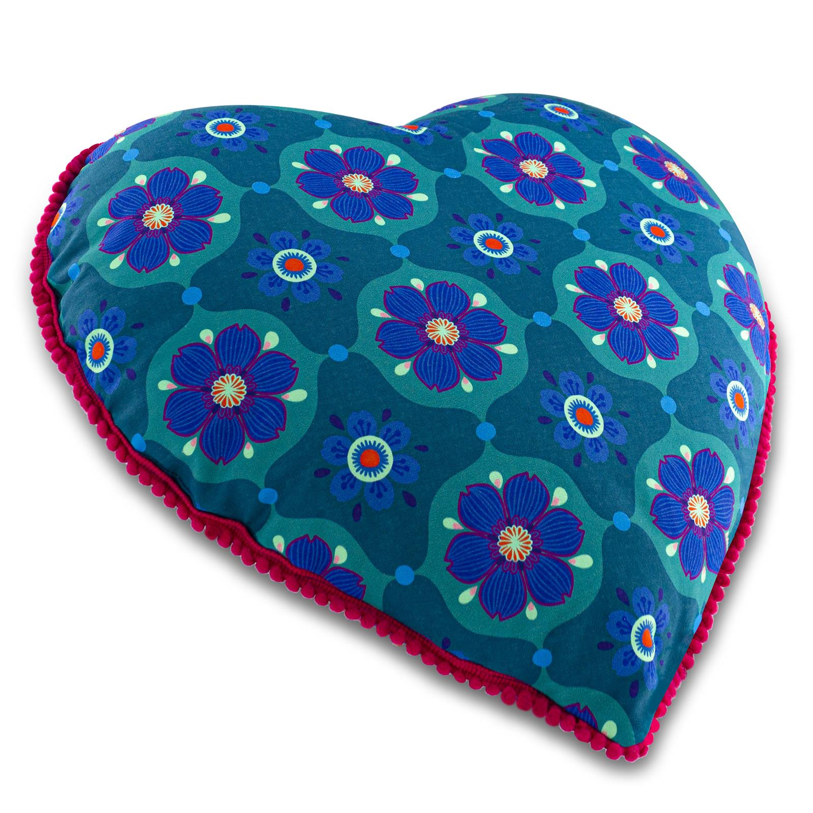 Das mit sehr viel Liebe zum Detail gestaltete große blaue Herzkissenmotiv wurde mit dem „Blaue Retro Blumen“ Stoff auf der Rückseite kombiniert und mit einem lustigen Band aus pinkfarbenen Pompoms ergänzt. Da geht einem das Herz auf!