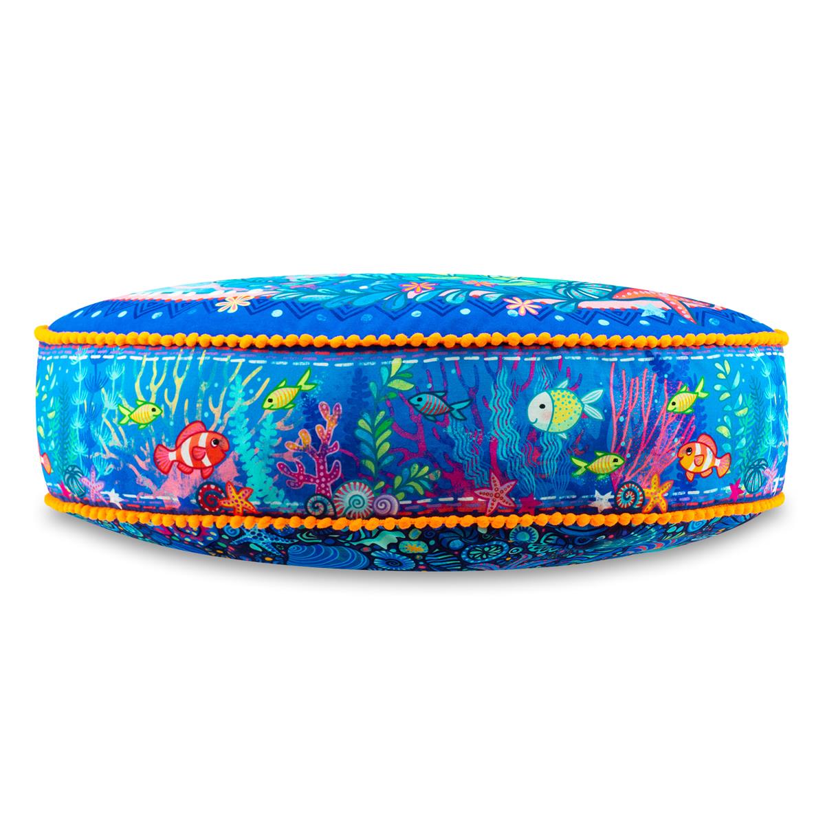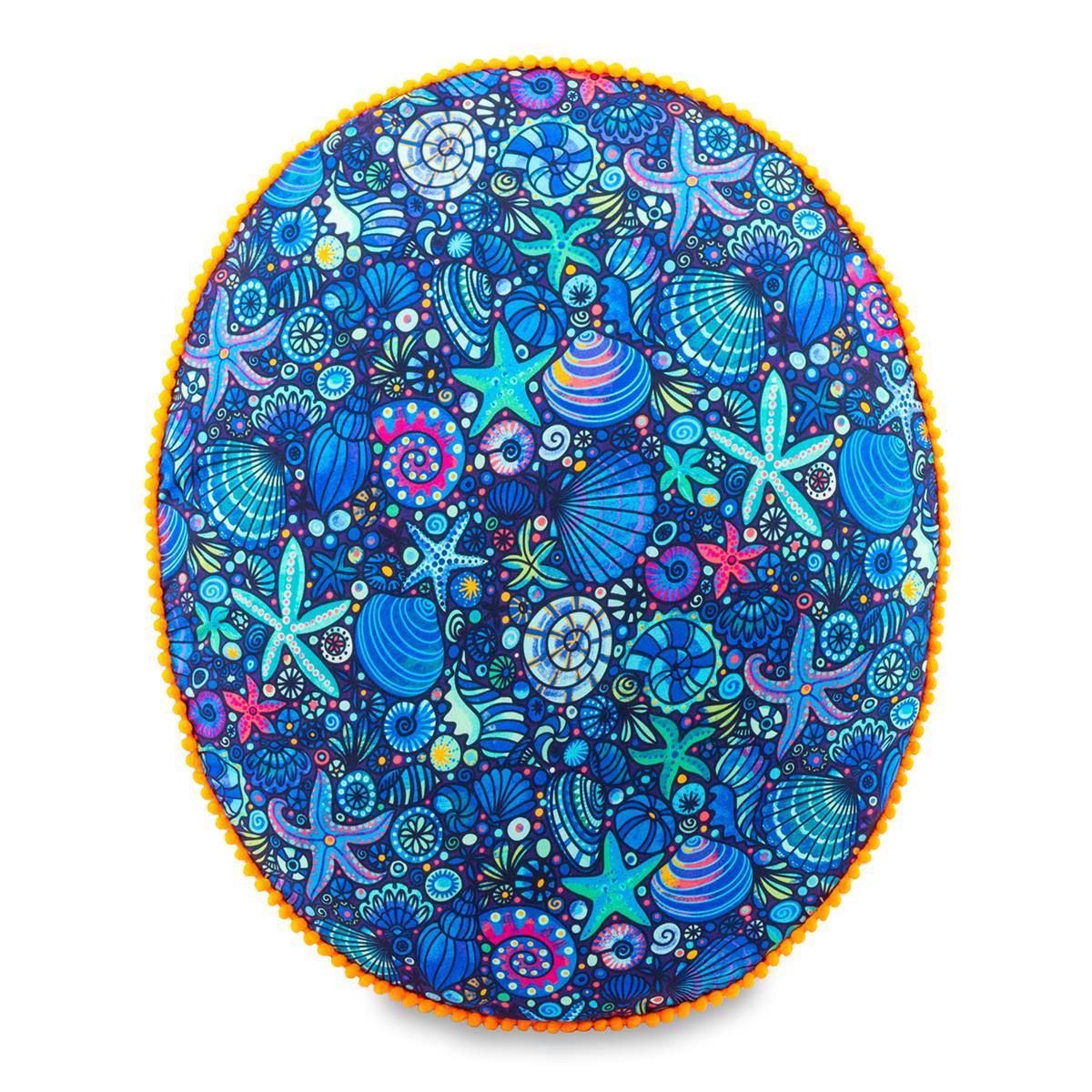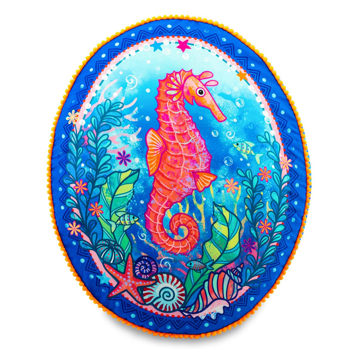 Das mit sehr viel Liebe zum Detail gestaltete Seepferdchenmotiv wurde mit dem "Tiefseeblauen Meeresboden" Stoff auf der Rückseite kombiniert und mit einer orangefarbenen Pompom-Borte versehen. Für große und kleine Meeresliebhaber!