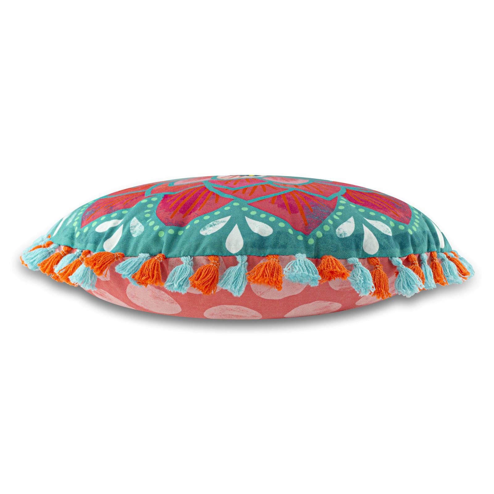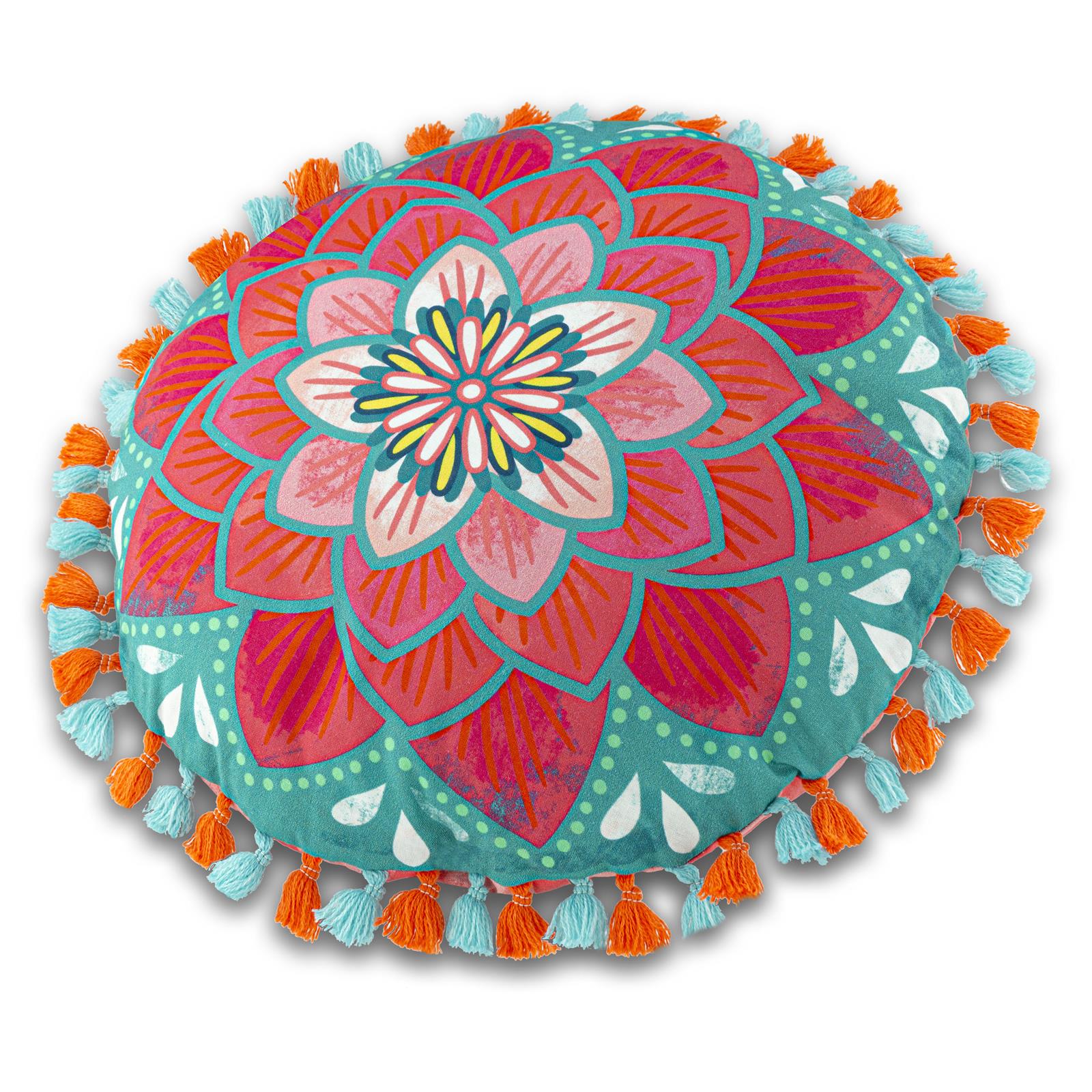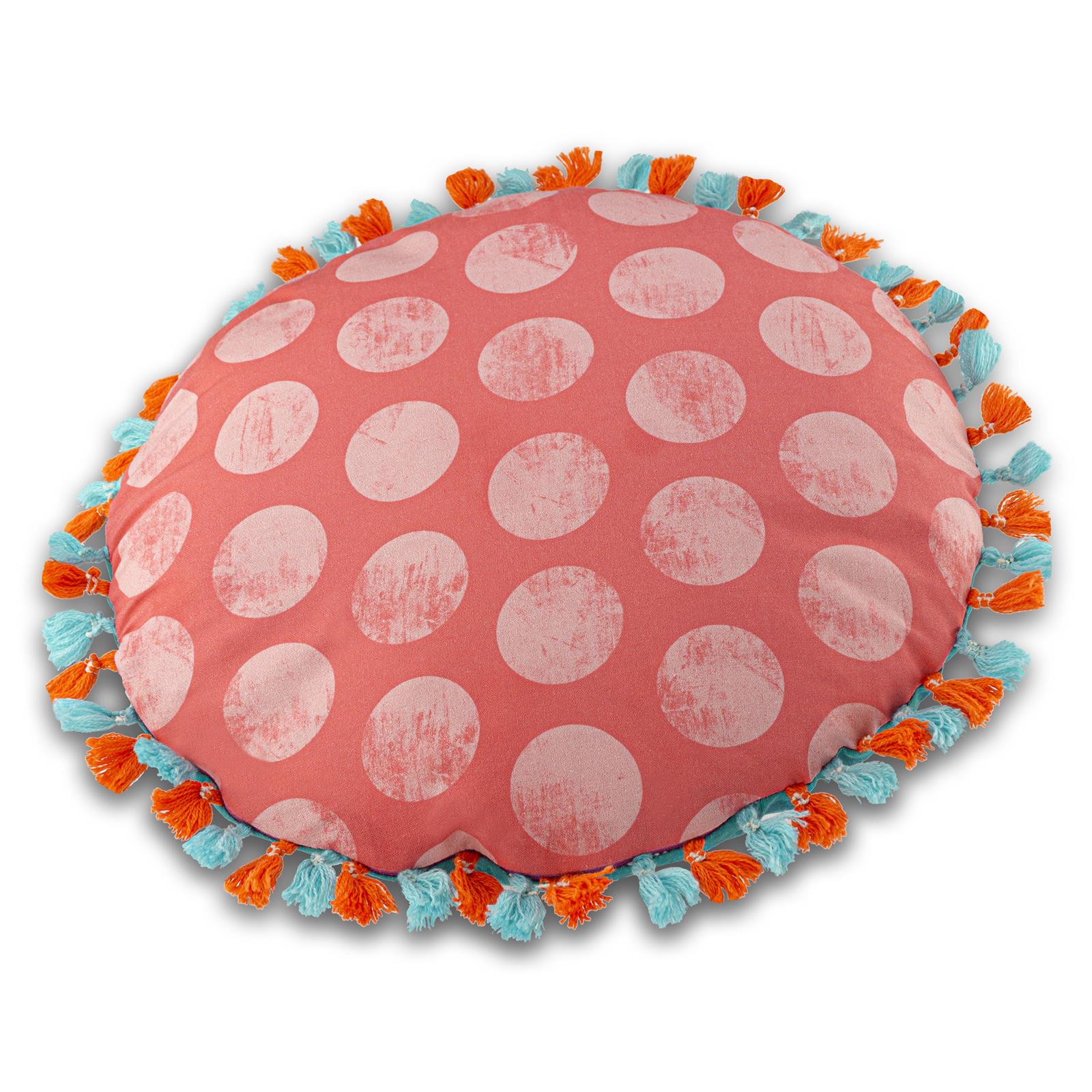 Das unglaublich schön in Rottönen entworfene Seerosenmotiv wurde mit „Fetten Rosa Punkten“ auf der Rückseite kombiniert und mit einer 2-farbigen Boho-Quastenborte veredelt. Das Kissen mit „WOW“-Effekt!