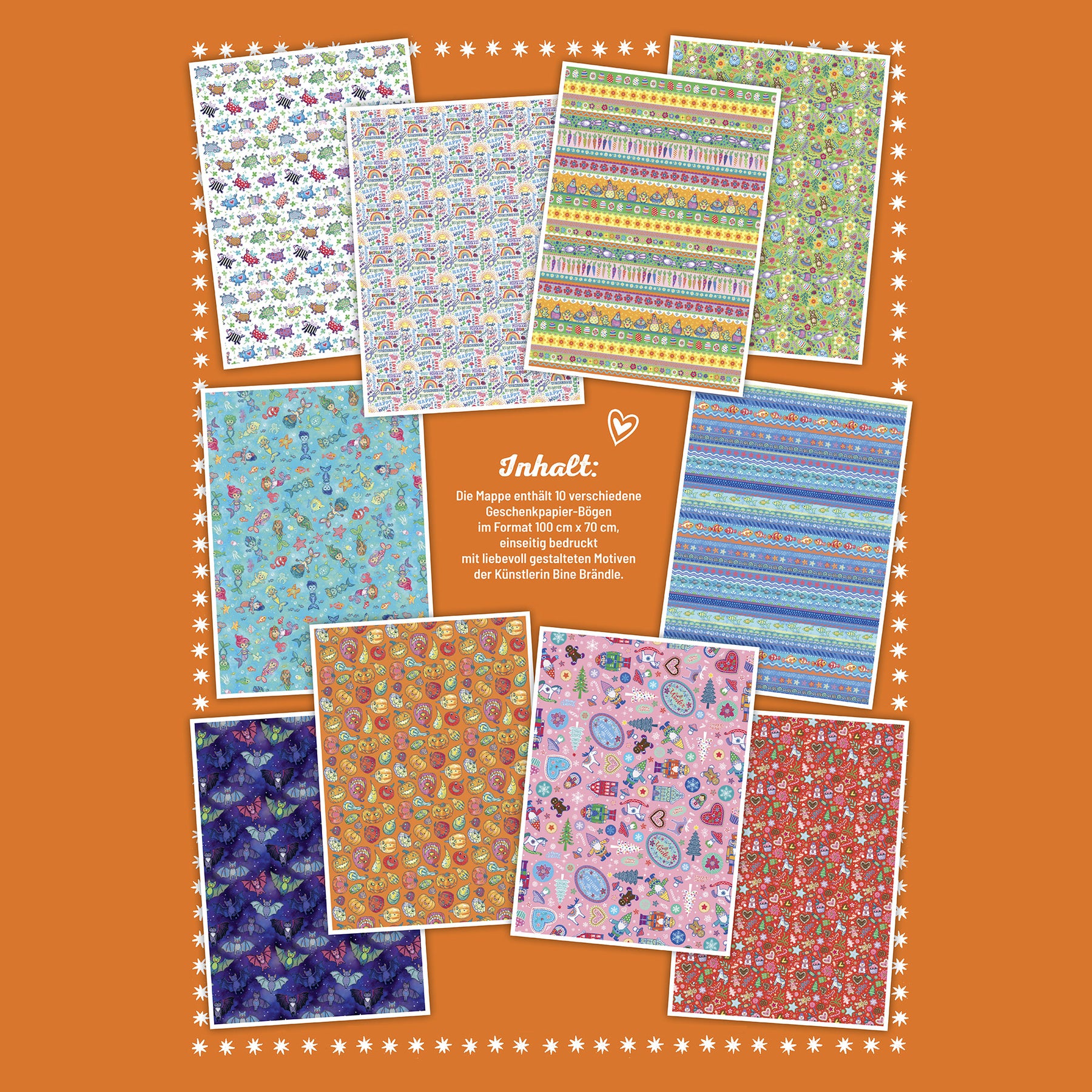 Die Mappe enthält 10 verschiedene Geschenkpapier-Bögen im Format 100 cm x 70 cm, einseitig bedruckt mit liebevoll gestalteten Motiven der Künstlerin Bine Brände.