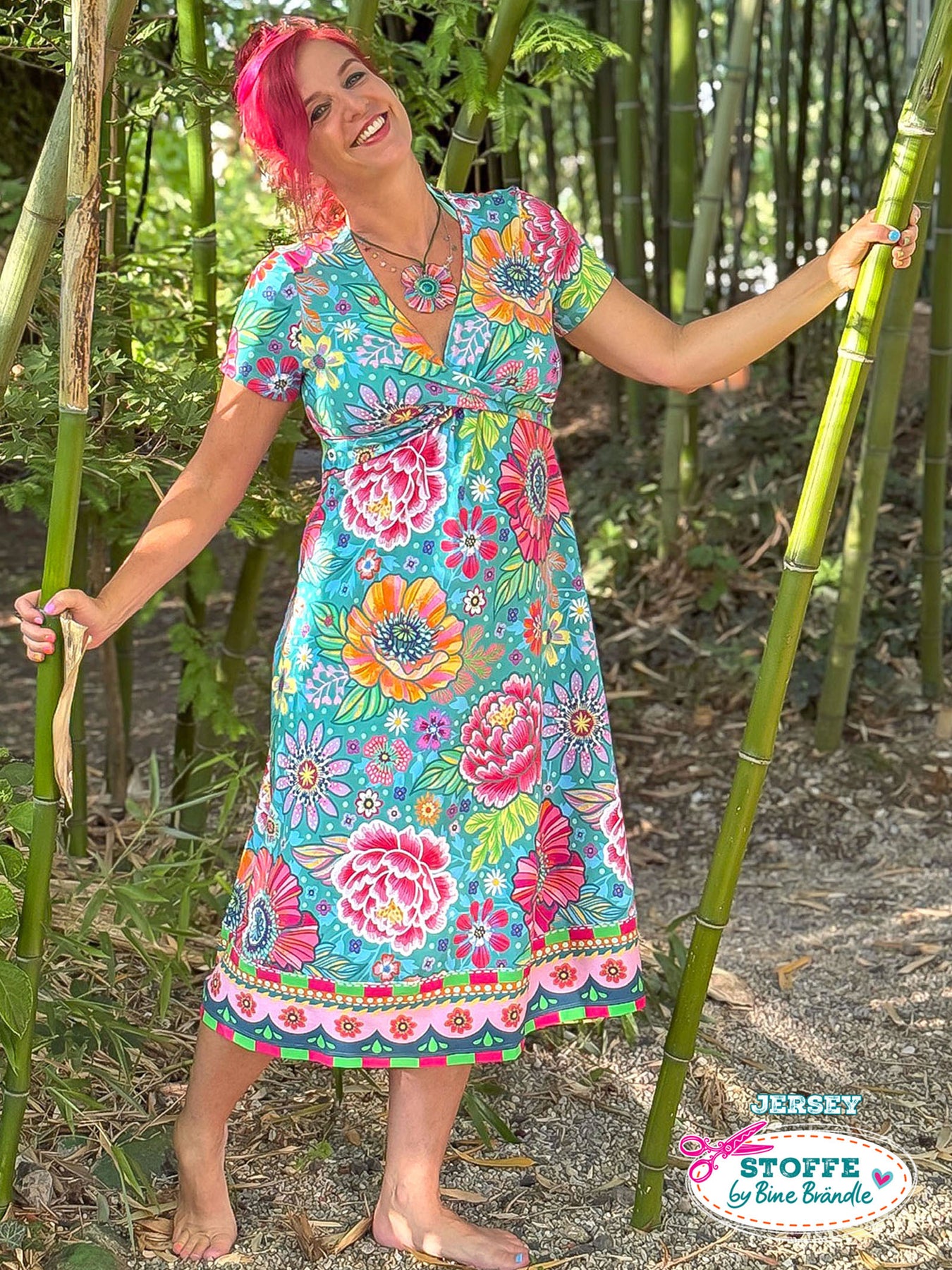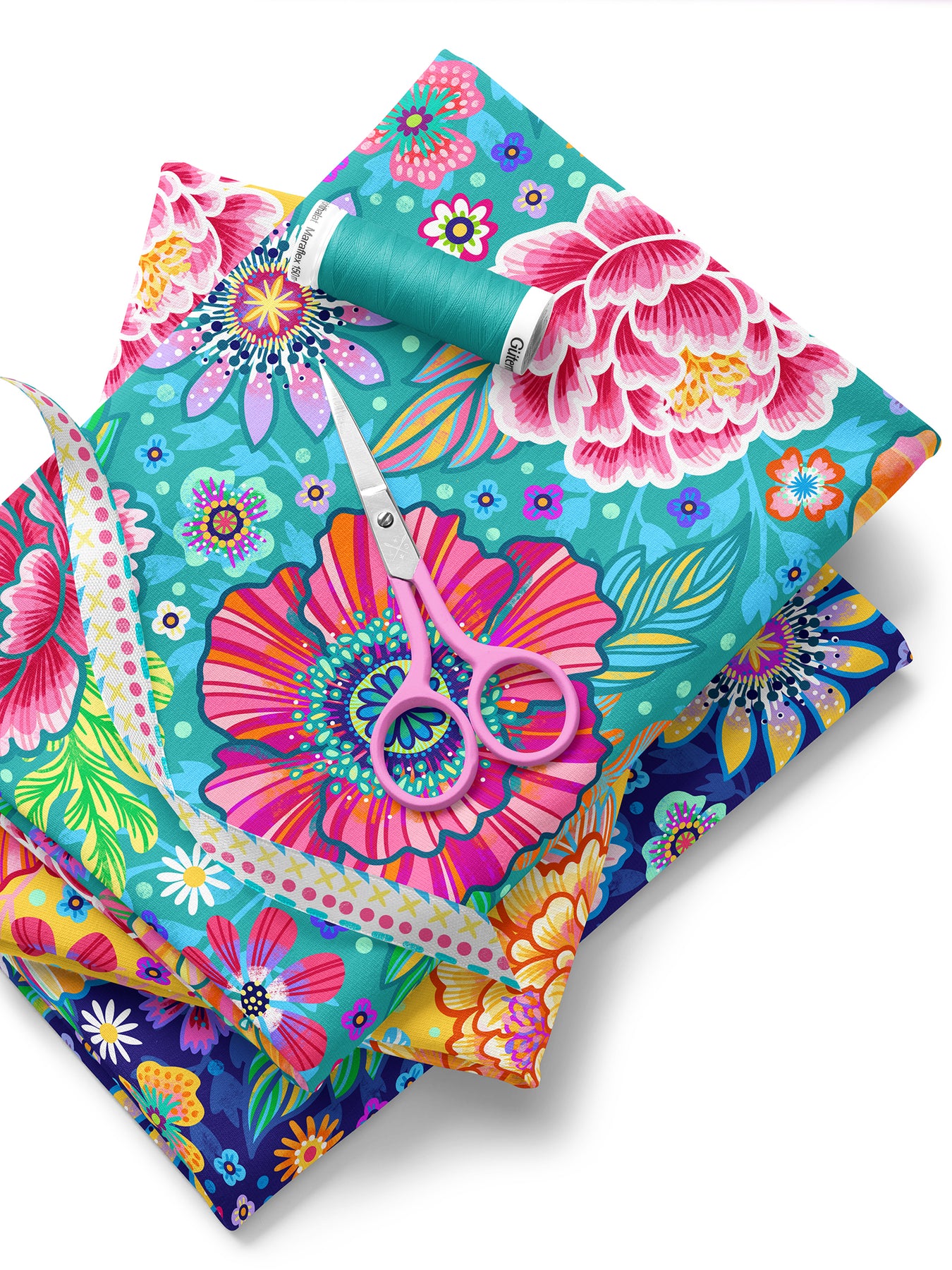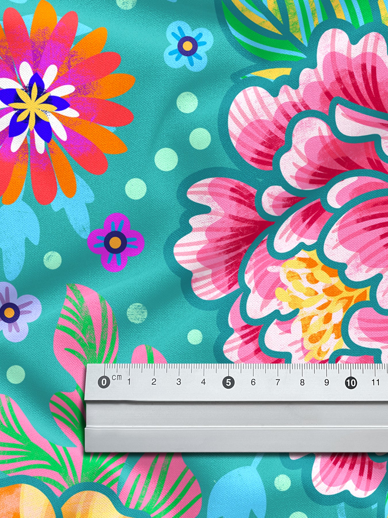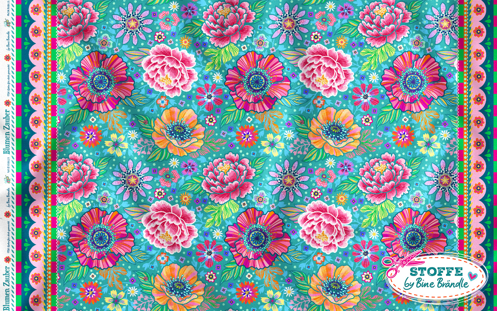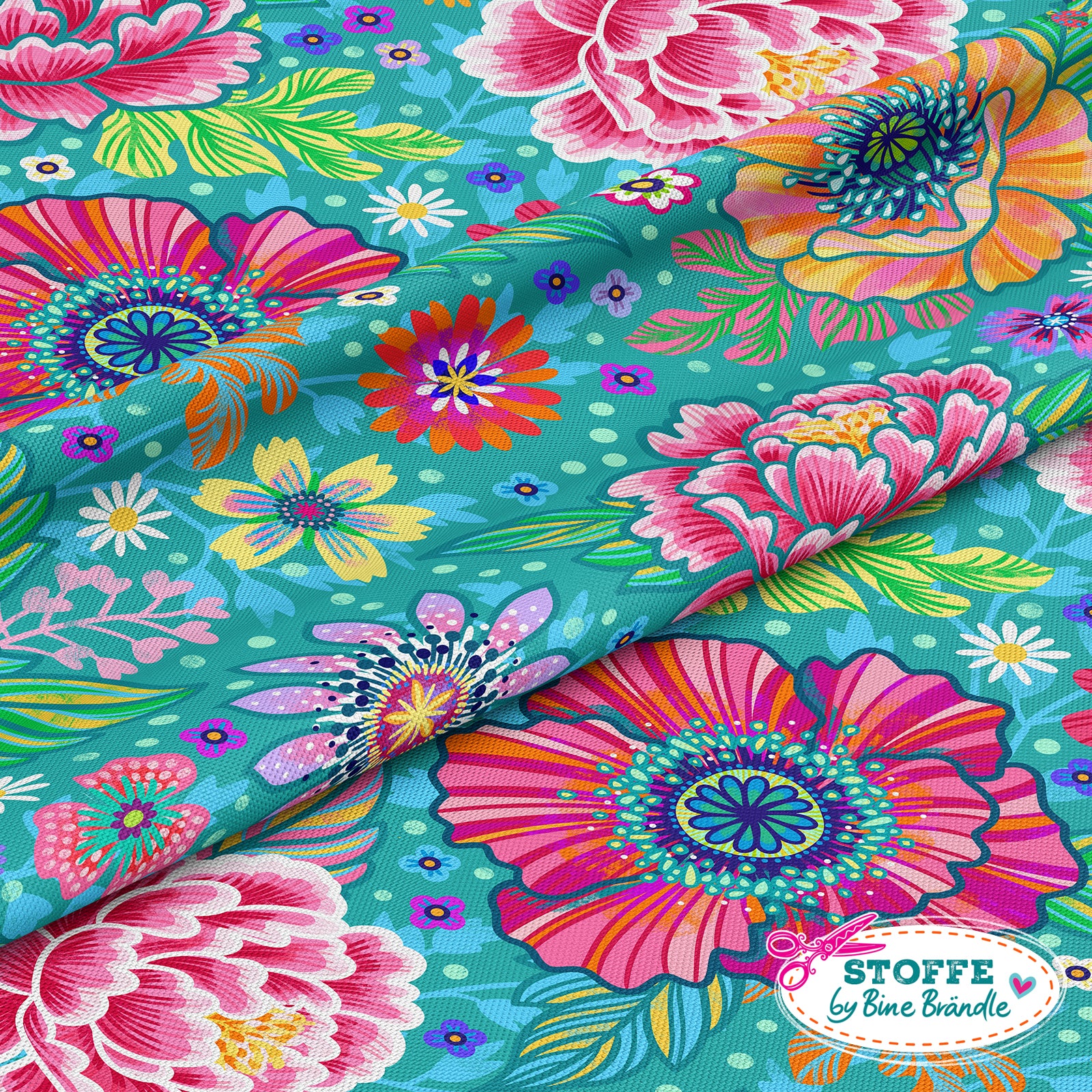 Farbenfroher Stoff mit dem Motiv "Blumenzauber türkis".