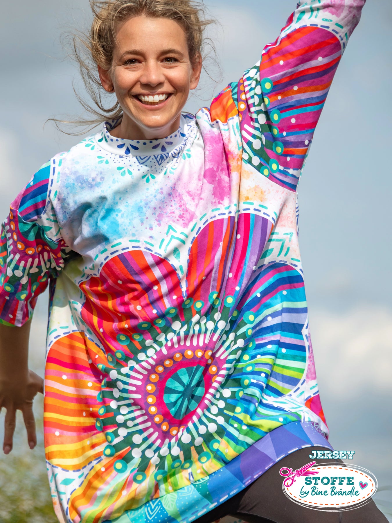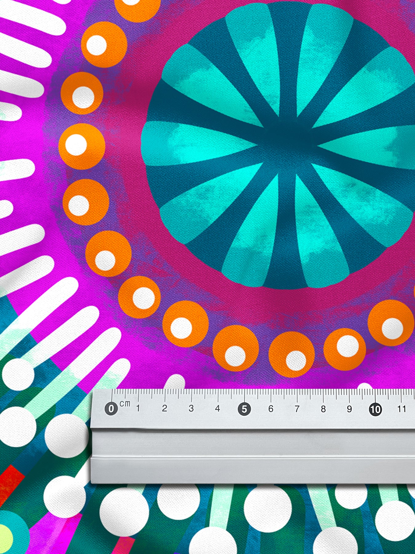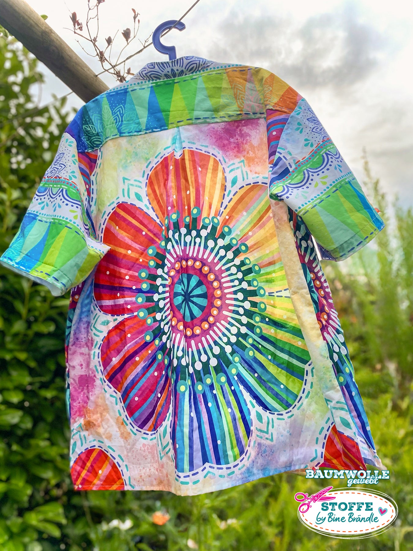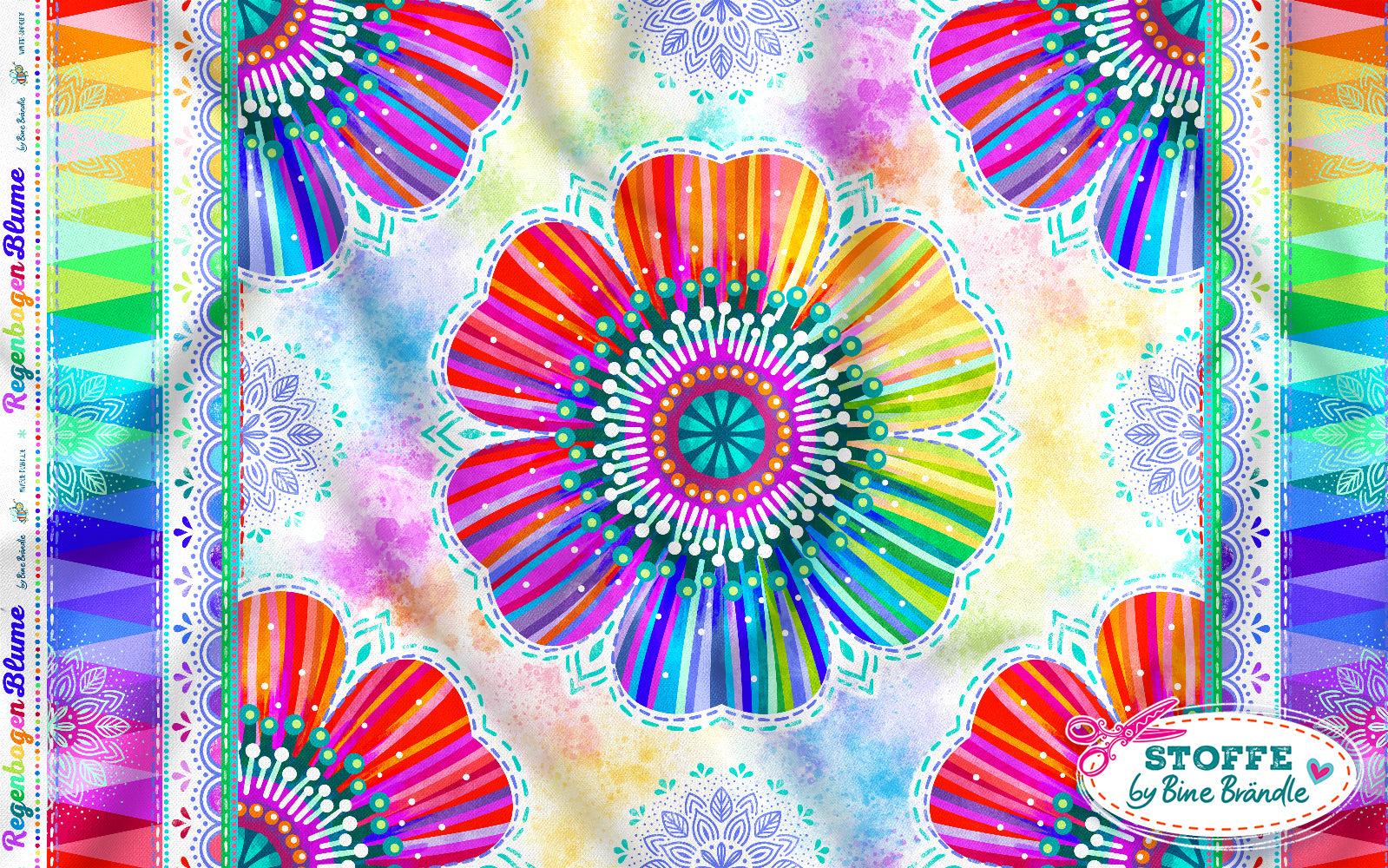 Farbenfroher Stoff mit dem Motiv "Regenbogenblume".