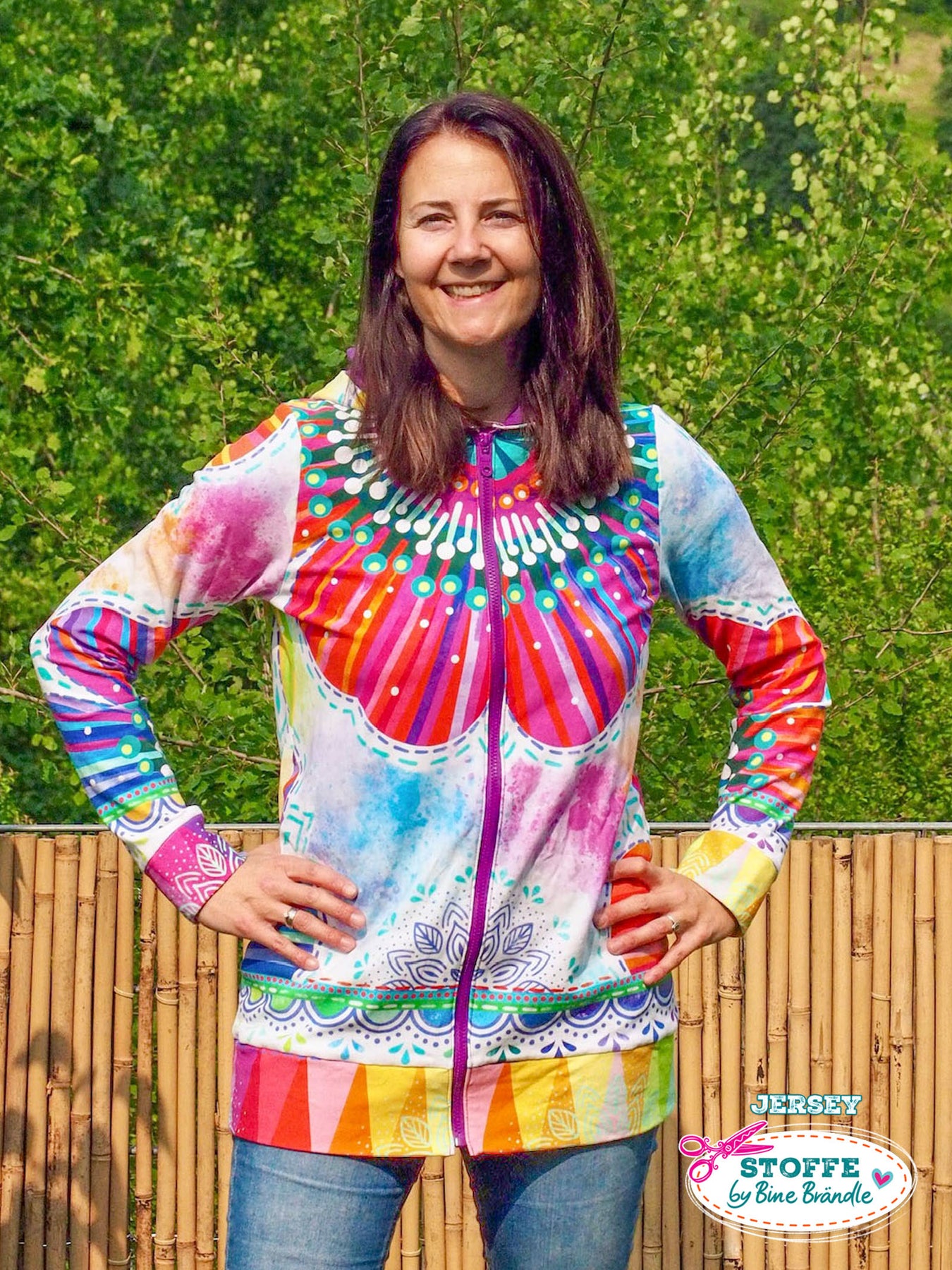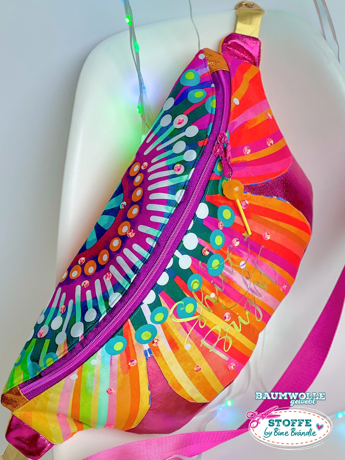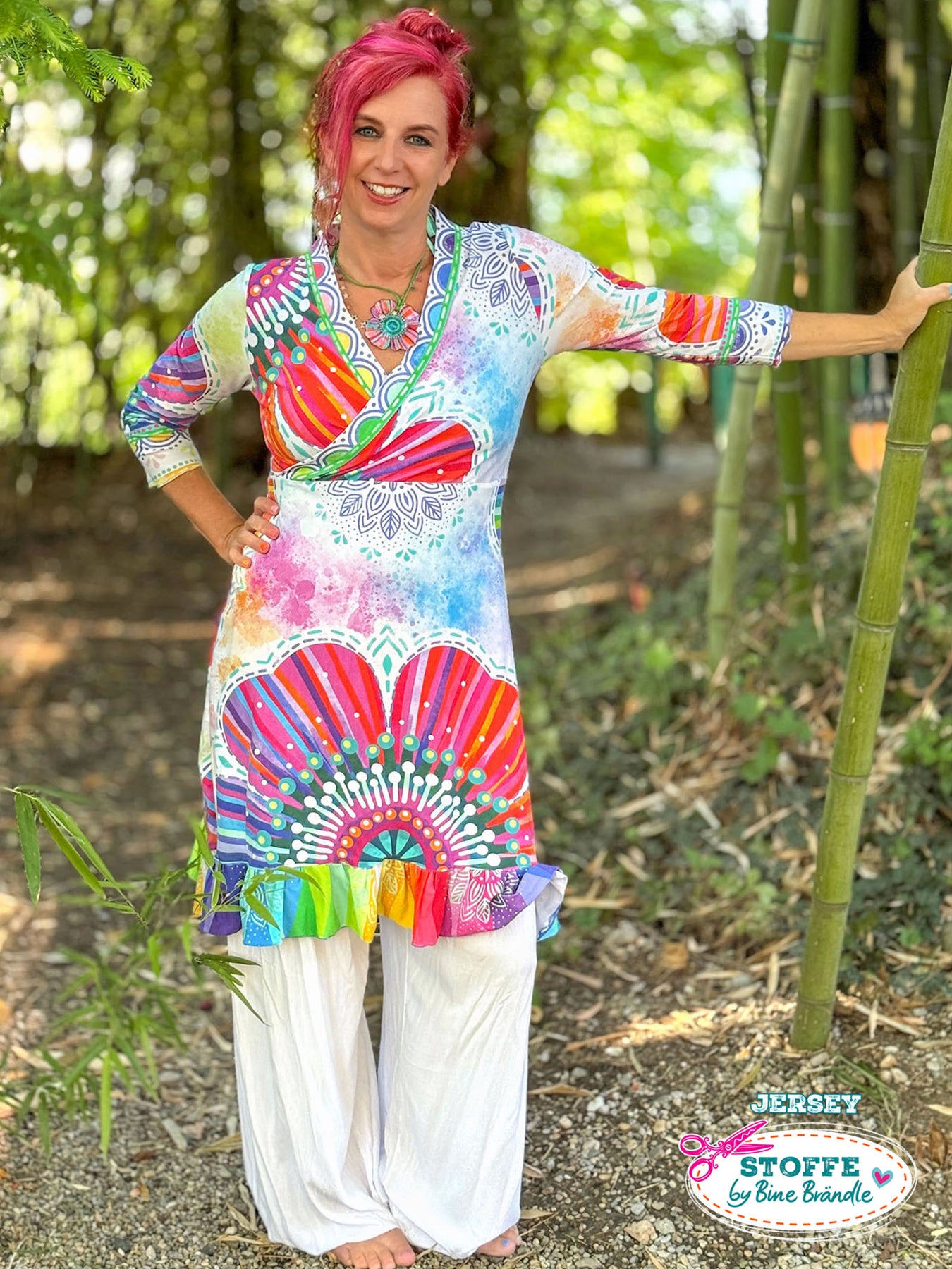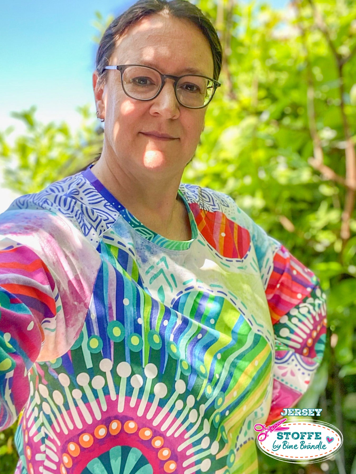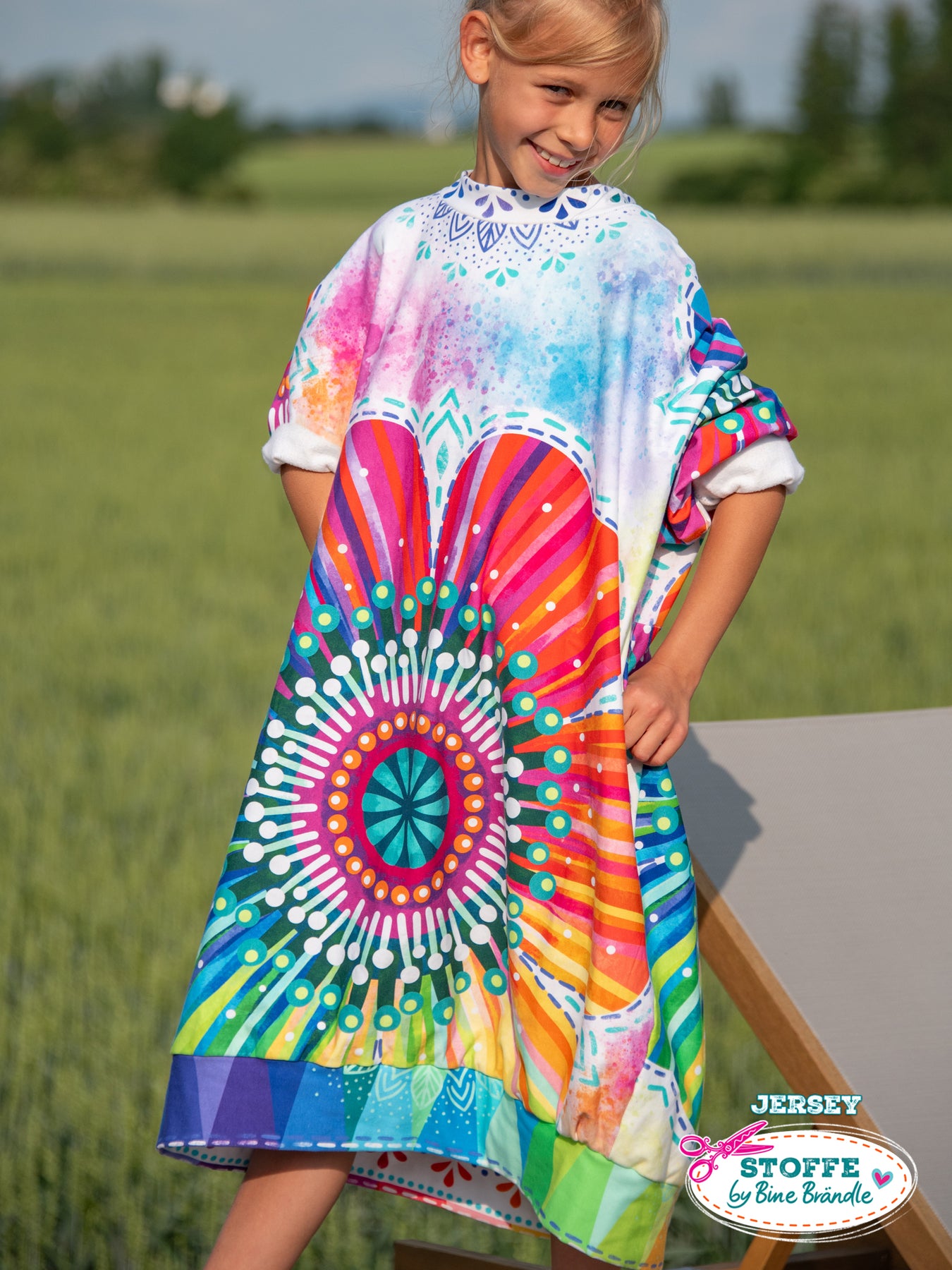 Farbenfroher Stoff mit dem Motiv "Regenbogenblume".