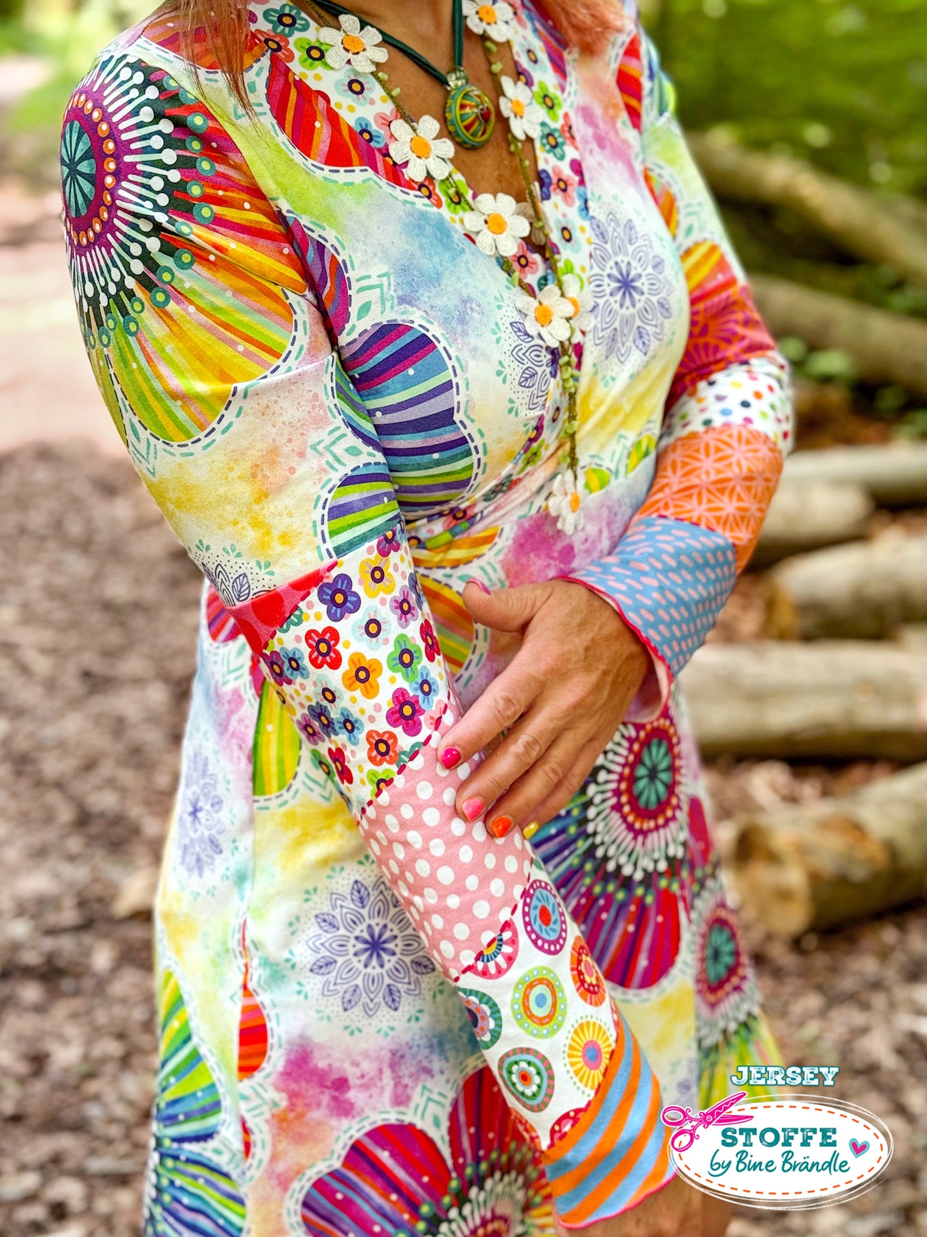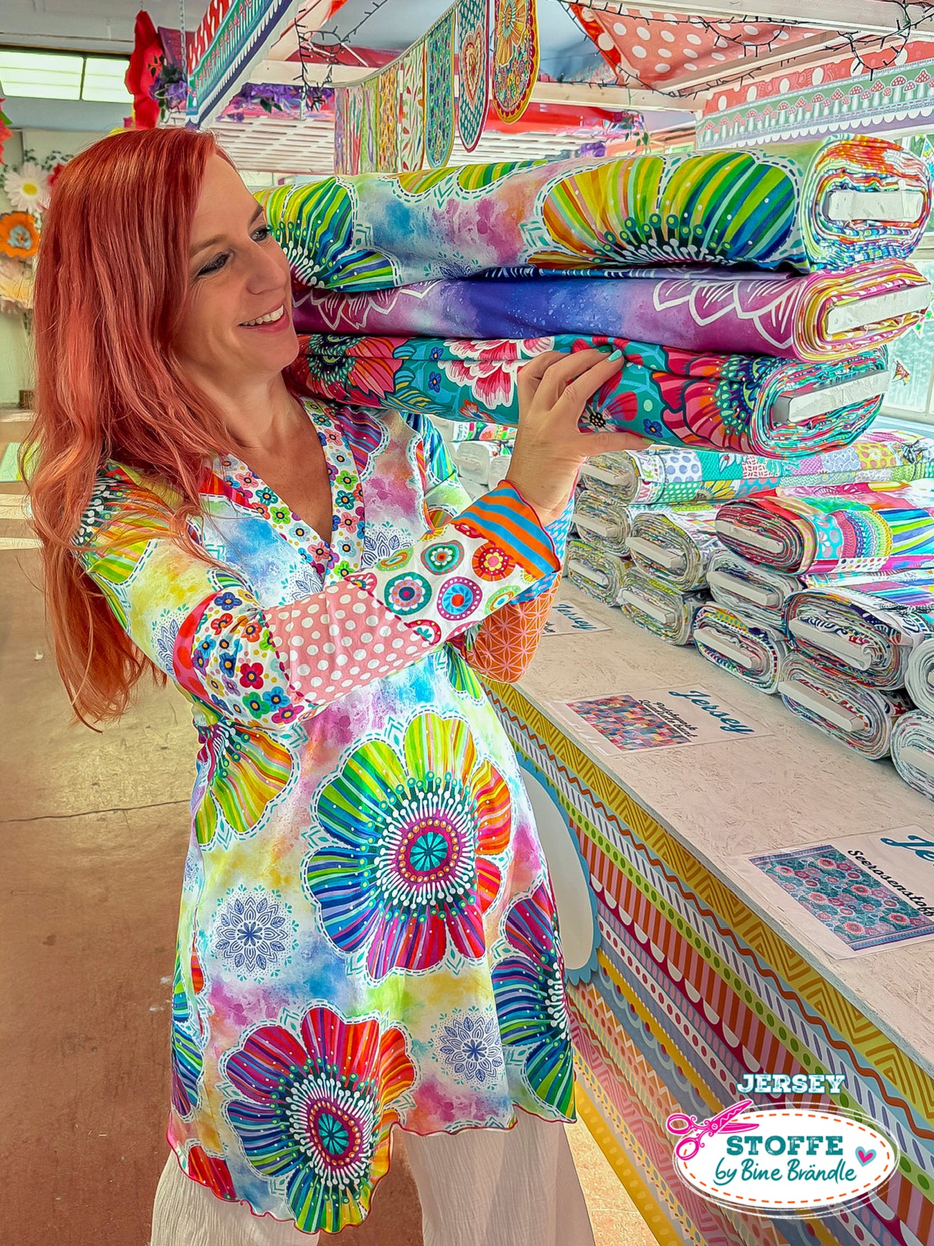 Farbenfroher Stoff mit dem Motiv "Regenbogenblume viele".