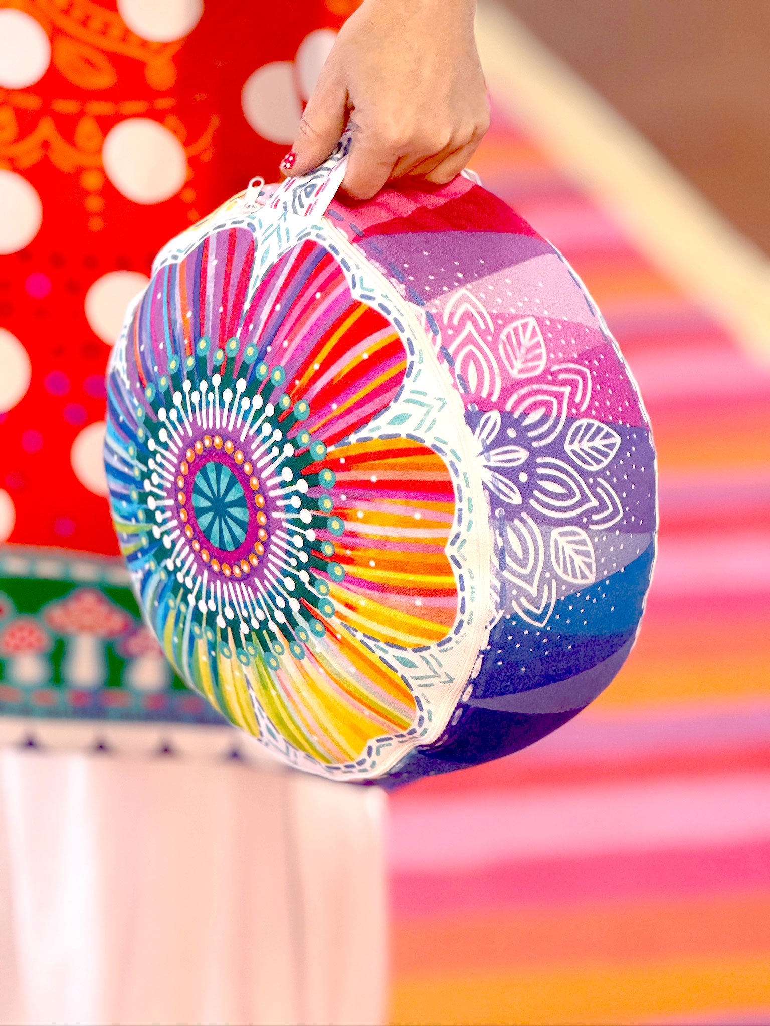 Das einmalige Mandalamotiv mit 15 cm hohen Bordürenrand ist die wunderschöne Grundlage für wertvolle Achtsamkeitsübungen. Vielseitig als Yoga- und Meditationskissen oder als dekoratives Bodensitzkissen verwendbar.