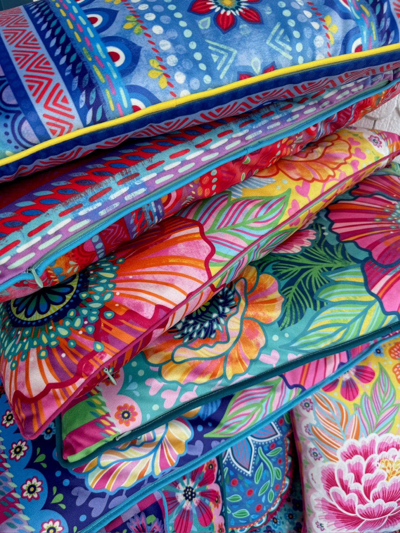 Die Dekokissen sind in unterschiedlichen Größen und Motiven erhältlich, kombiniert mit Biesen, Bommeln/ Pompoms und Quasten im Boho-Style. Dank der unterschiedlichen Rückseiten kann die Ansicht ständig gewechselt werden. Mixen Sie wild durcheinander! Je mehr Farben und Designs, umso besser, denn alles passt zusammen.
