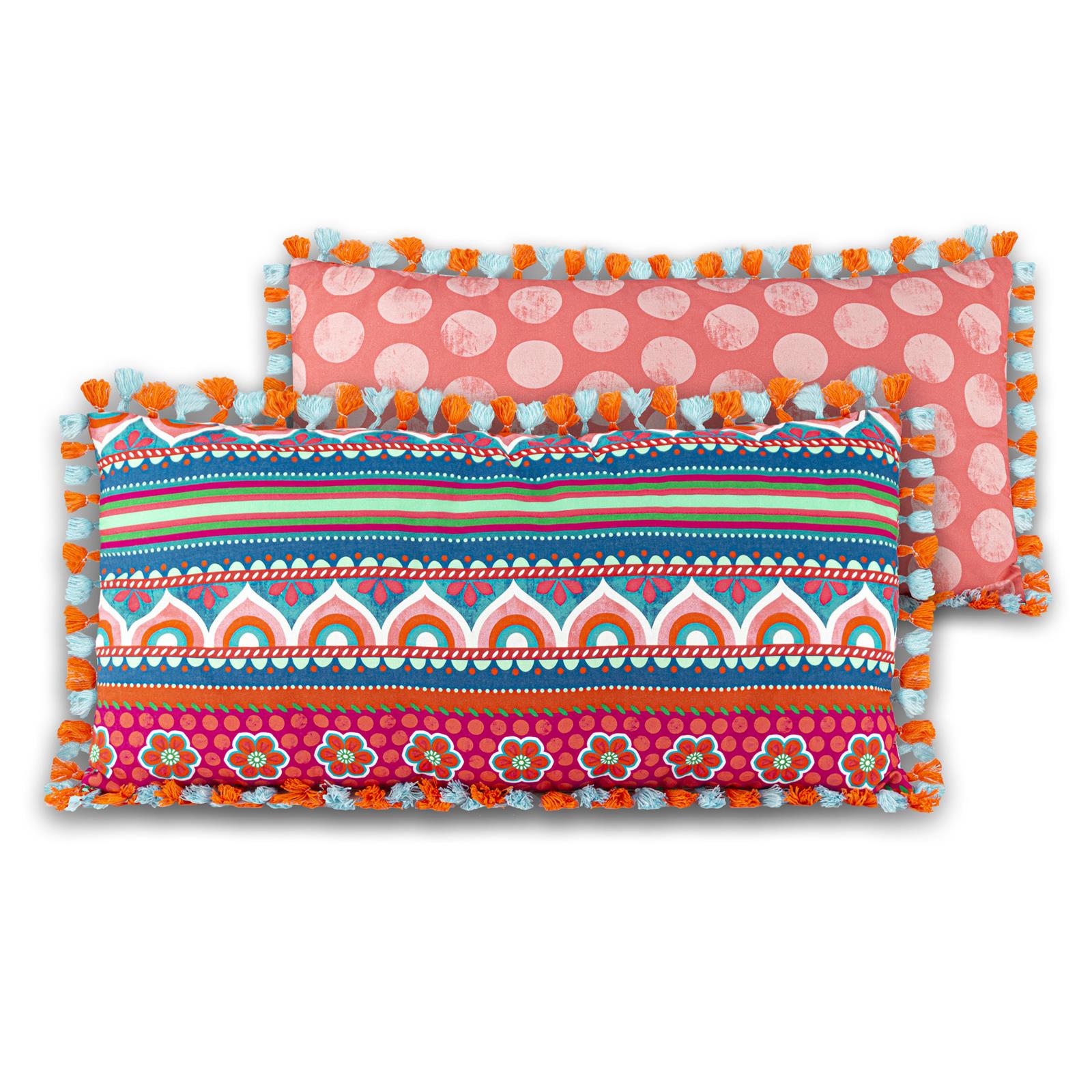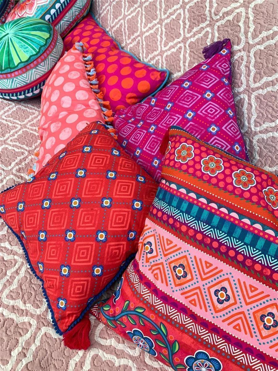 Die Dekokissen sind in unterschiedlichen Größen und Motiven erhältlich, kombiniert mit Biesen, Bommeln/ Pompoms und Quasten im Boho-Style. Dank der unterschiedlichen Rückseiten kann die Ansicht ständig gewechselt werden. Mixen Sie wild durcheinander! Je mehr Farben und Designs, umso besser, denn alles passt zusammen.