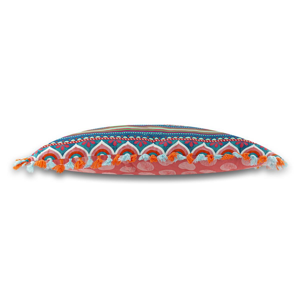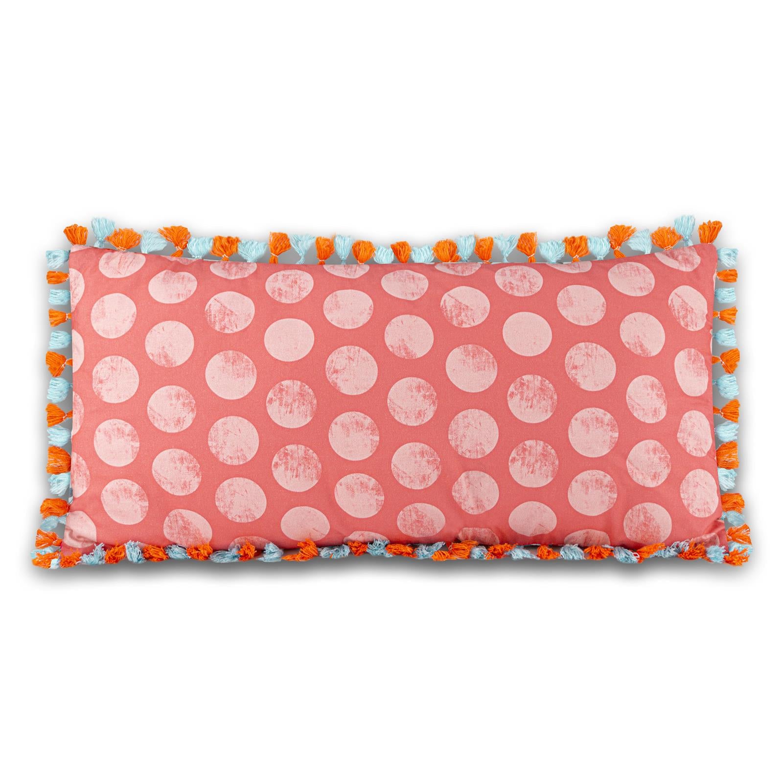 Der Bordürenstoff in Rottönen wurde mit „Fetten Rosa Punkten“ auf der Rückseite kombiniert und erhält durch eine 2-farbige Boho-Quastenborte noch einen Upgrade. Achtung: Aufgrund des Musterverlaufs kann jedes Kissen anders sein!