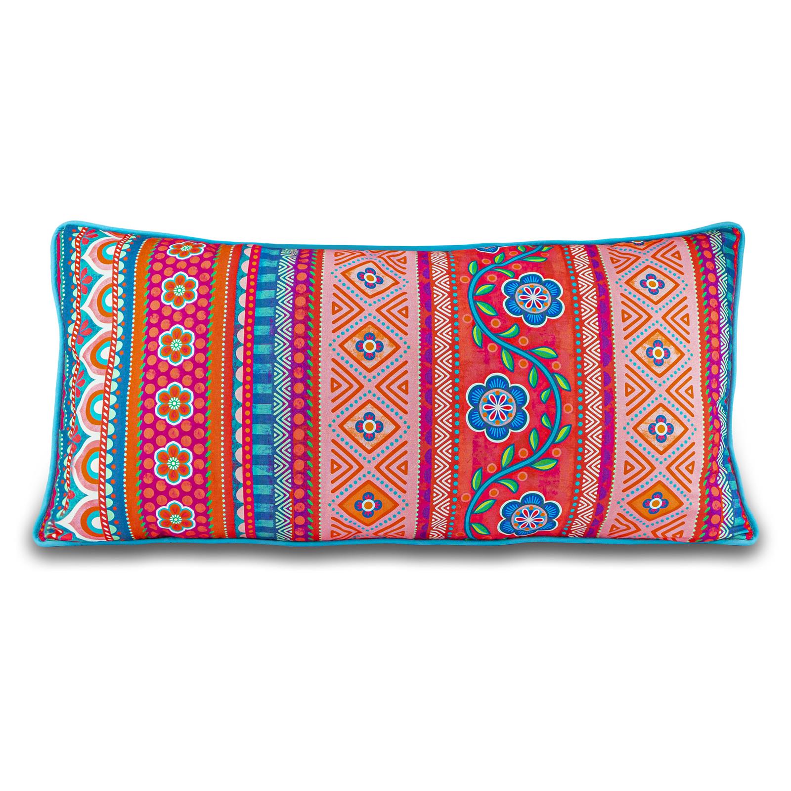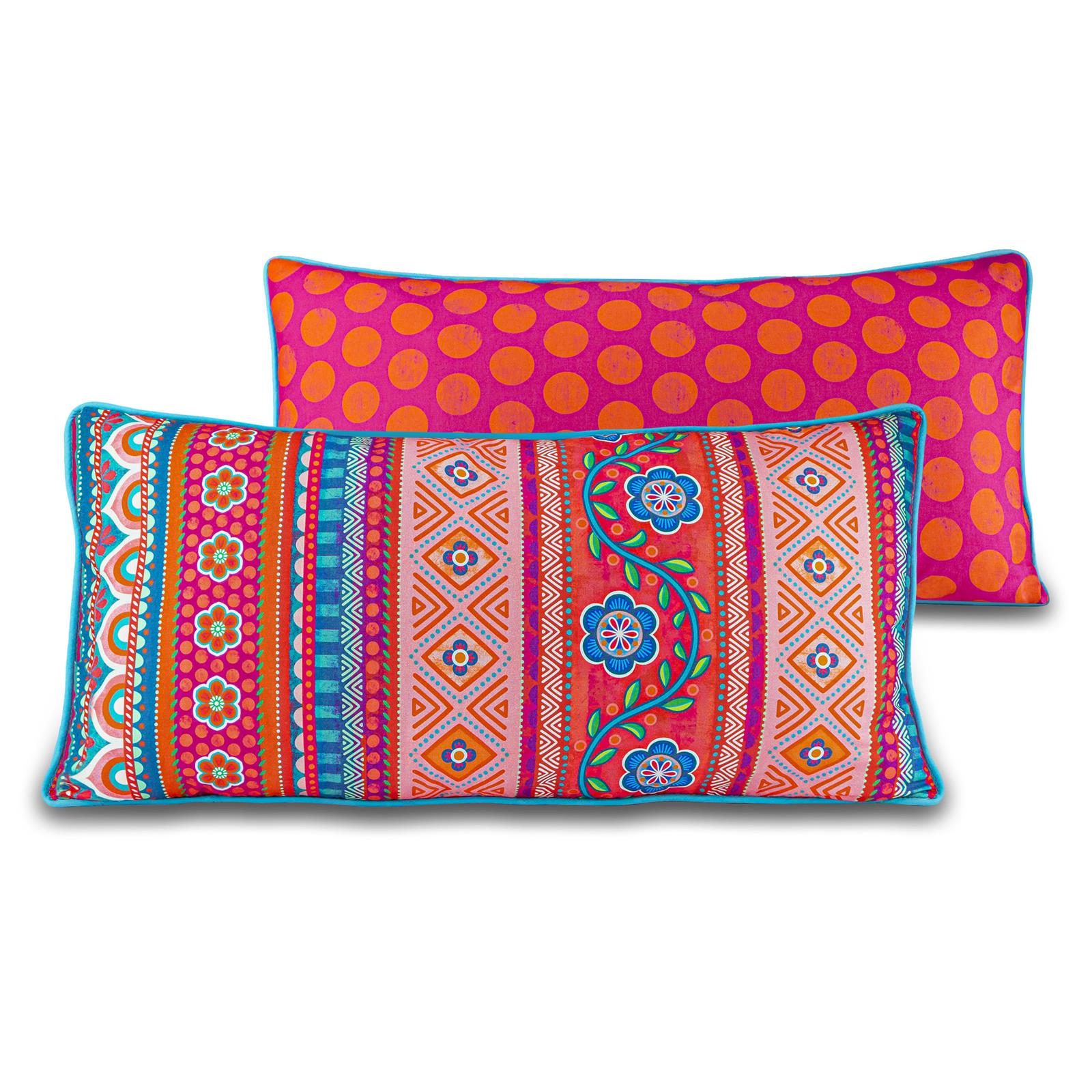 Die Dekokissen sind in unterschiedlichen Größen und Motiven erhältlich, kombiniert mit Biesen, Bommeln/ Pompoms und Quasten im Boho-Style. Dank der unterschiedlichen Rückseiten kann die Ansicht ständig gewechselt werden. Mixen Sie wild durcheinander! Je mehr Farben und Designs, umso besser, denn alles passt zusammen.