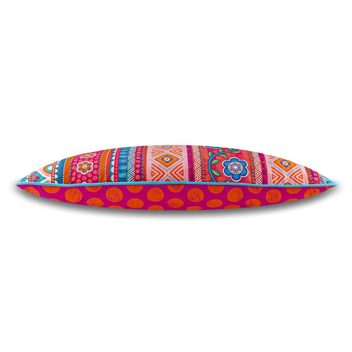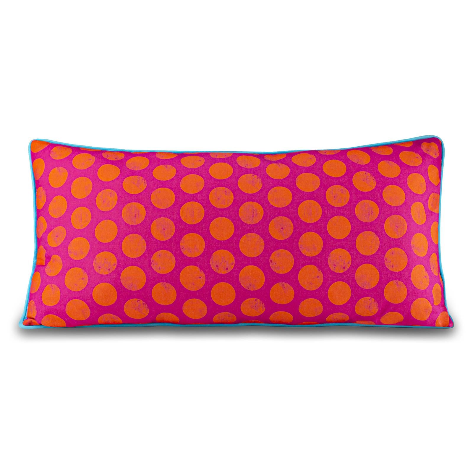 Der Bordürenstoff in Rottönen wurde mit „Fetten Roten Punkten“ auf der Rückseite kombiniert und mit einer hochwertigen türkisfarbenen Biese abgerundet. Achtung: Aufgrund des Musterverlaufs kann jedes Kissen anders sein!