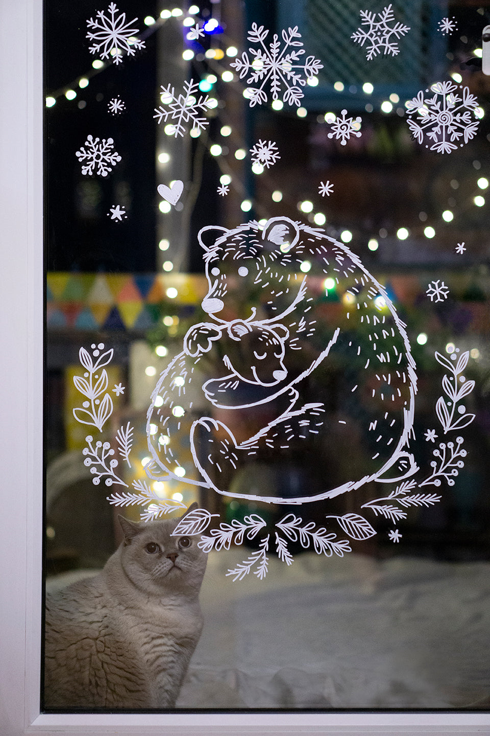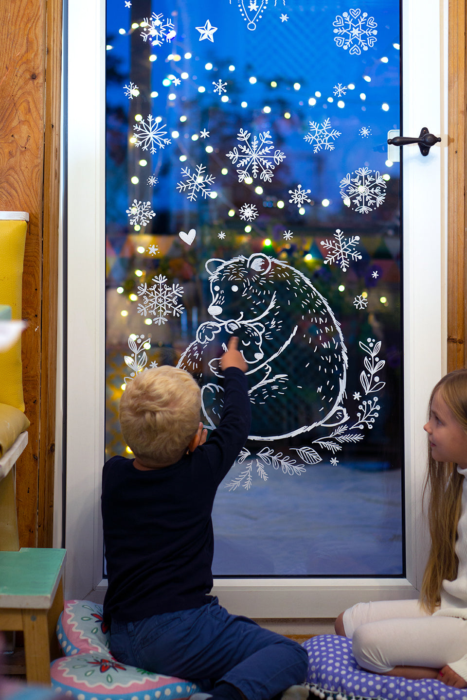 Mit diesem und den liebevoll entworfenen XXL Vorlagen zauberst du kinderleicht die schönsten Motive auf deine Fenster. Die Vorlagenbögen werden einfach hinter der Scheibe befestigt und die Linien mit dem Kreidestift nachgezeichnet.