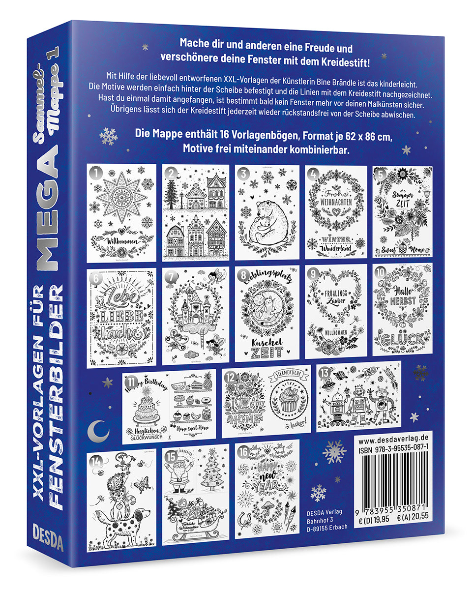 Diese 1. Sammelmappe von Bine Brändle enthält 16 wunderschöne, liebevoll entworfene XXL Vorlagen für Fensterbilder im Großformat 62cm x 86cm.