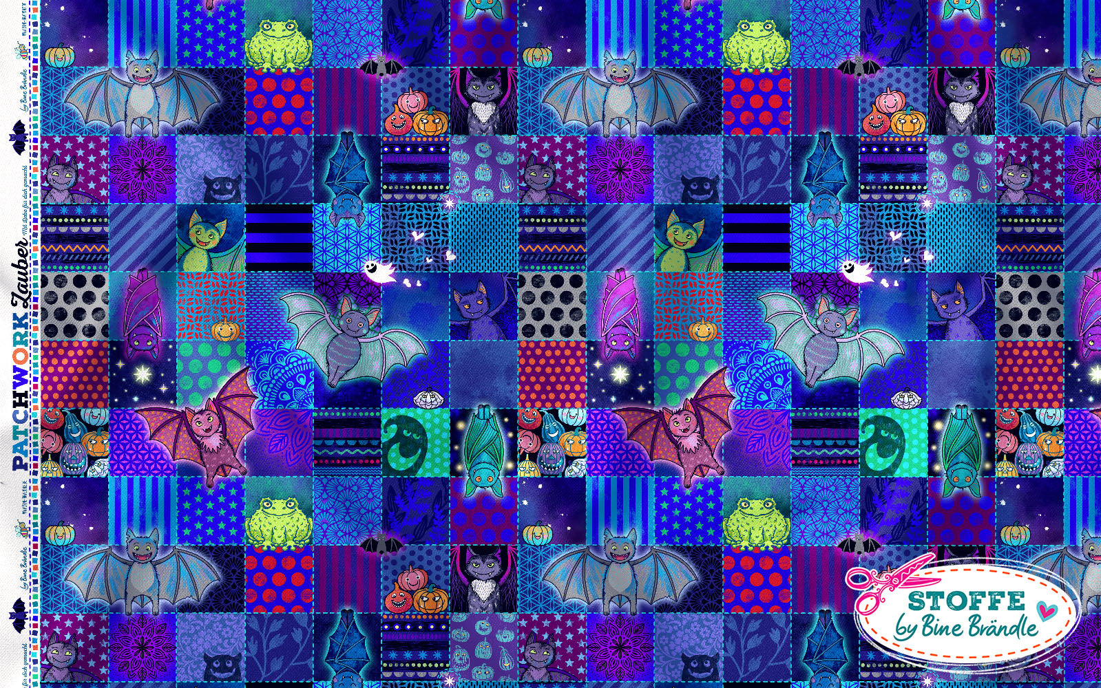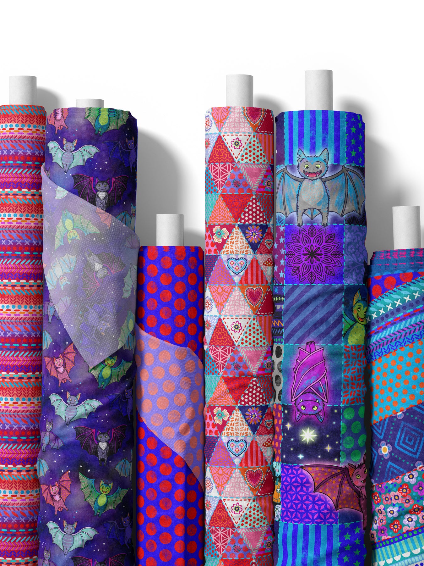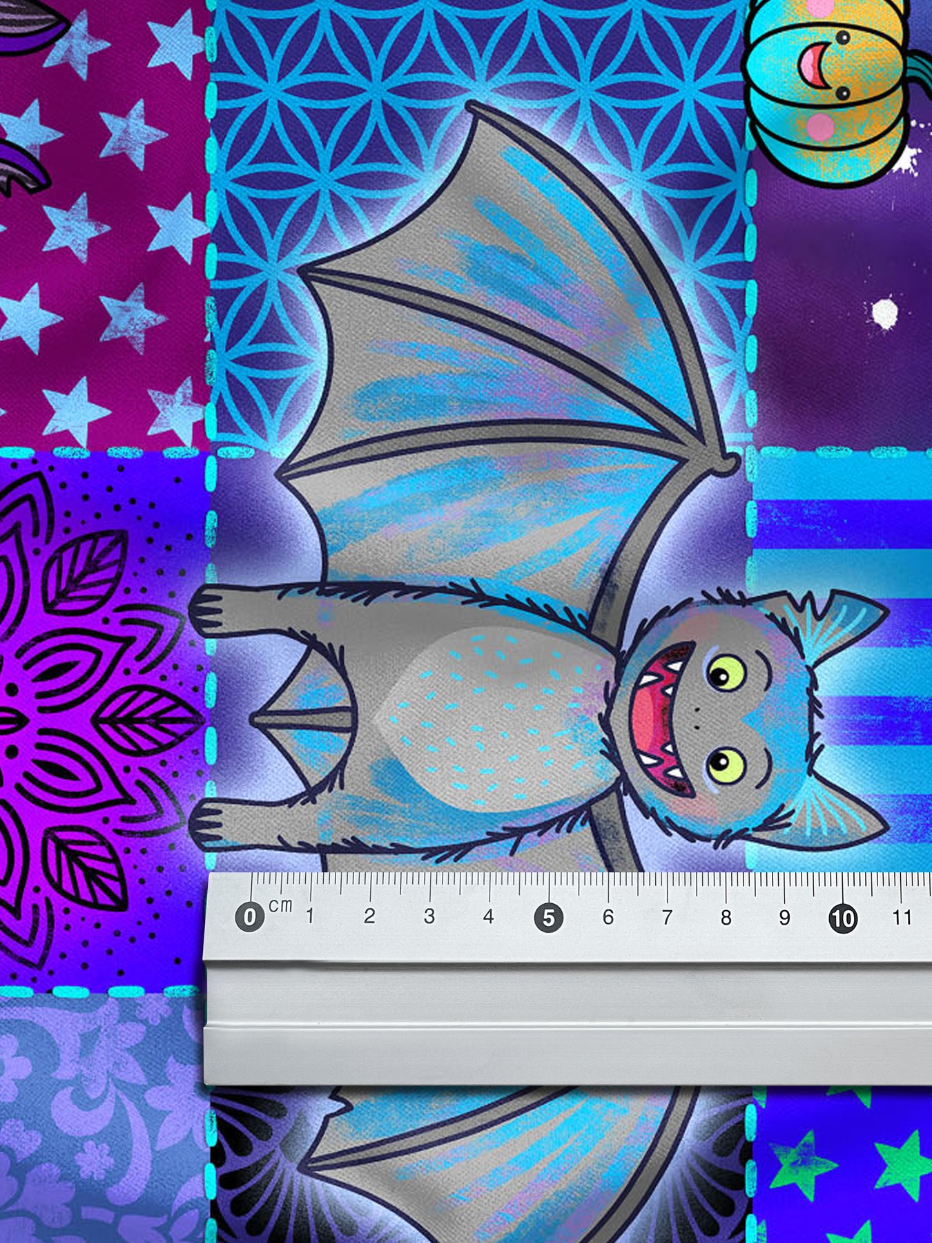 Farbenfroher Stoff mit dem Motiv "Patchwork Quadrate Fledermäuse".