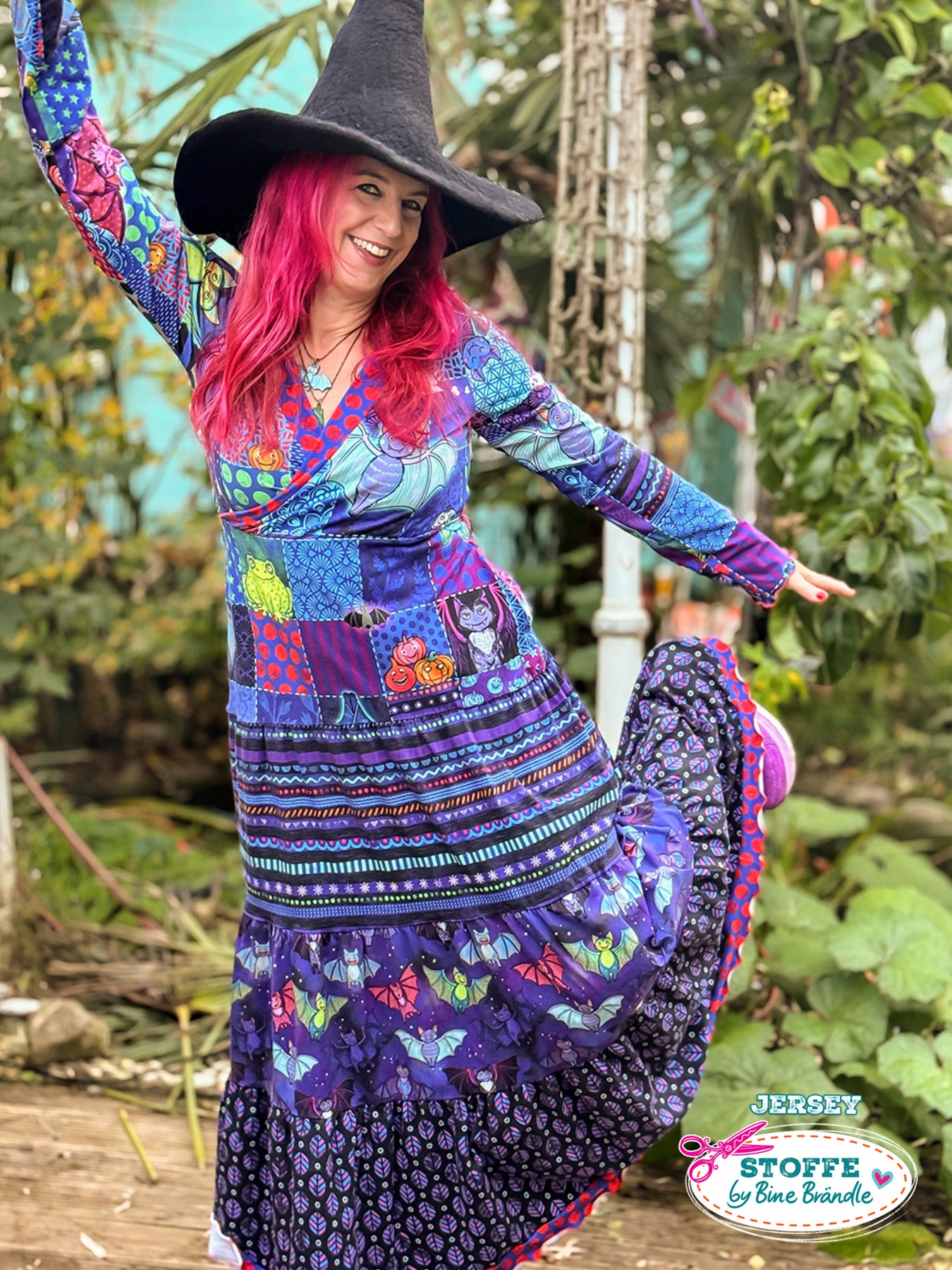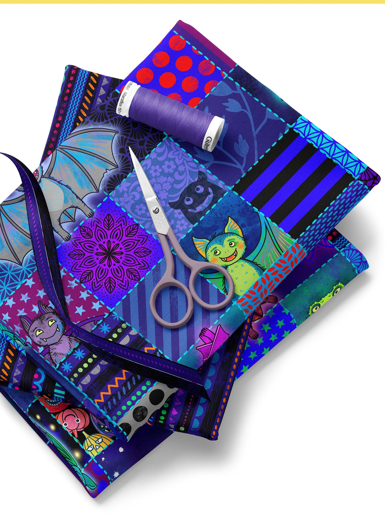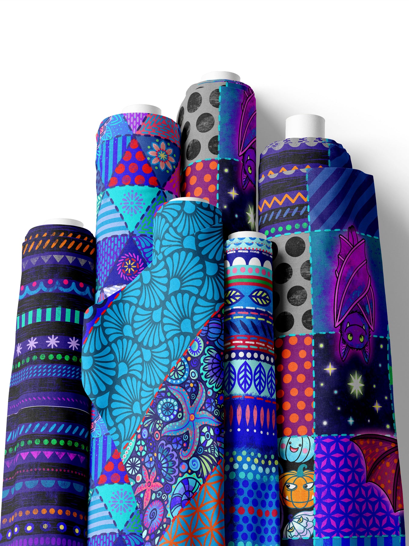 Farbenfroher Stoff mit dem Motiv "Patchwork Quadrate Fledermäuse".