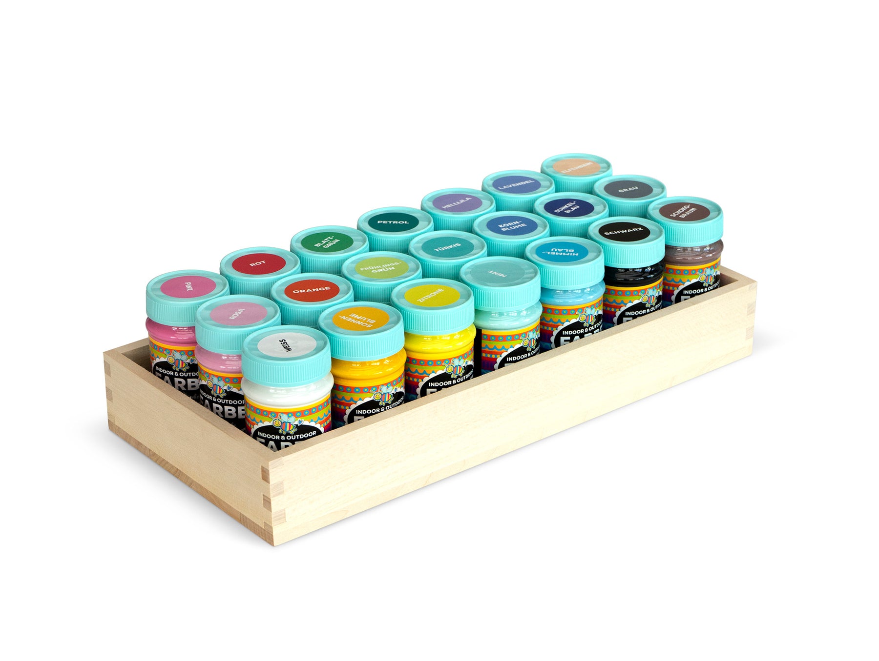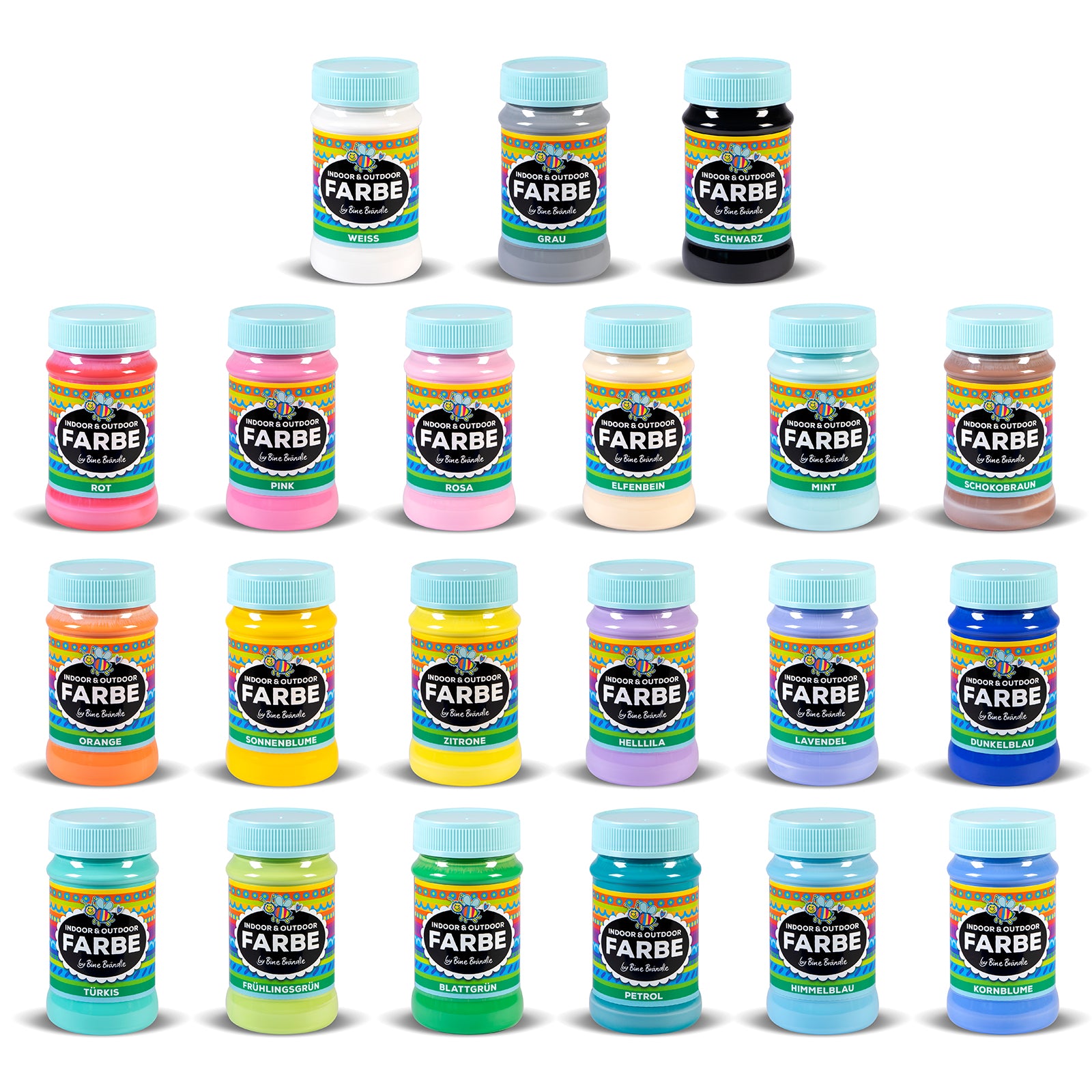 Das Bündel enthält 21 INDOOR & OUTDOOR FARBEN seidenmatt, mit jeweils 100ml Füllmenge.