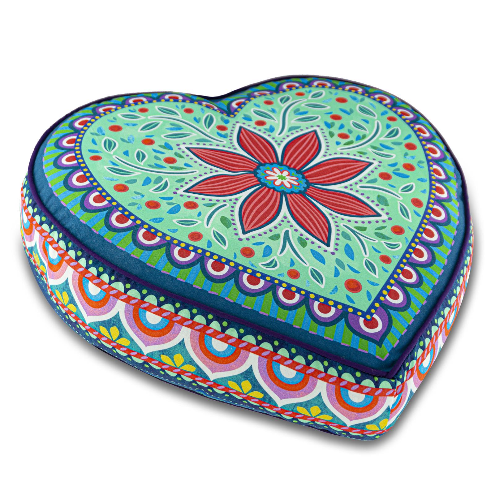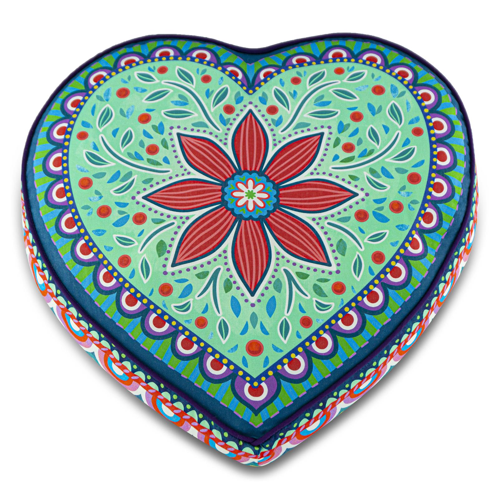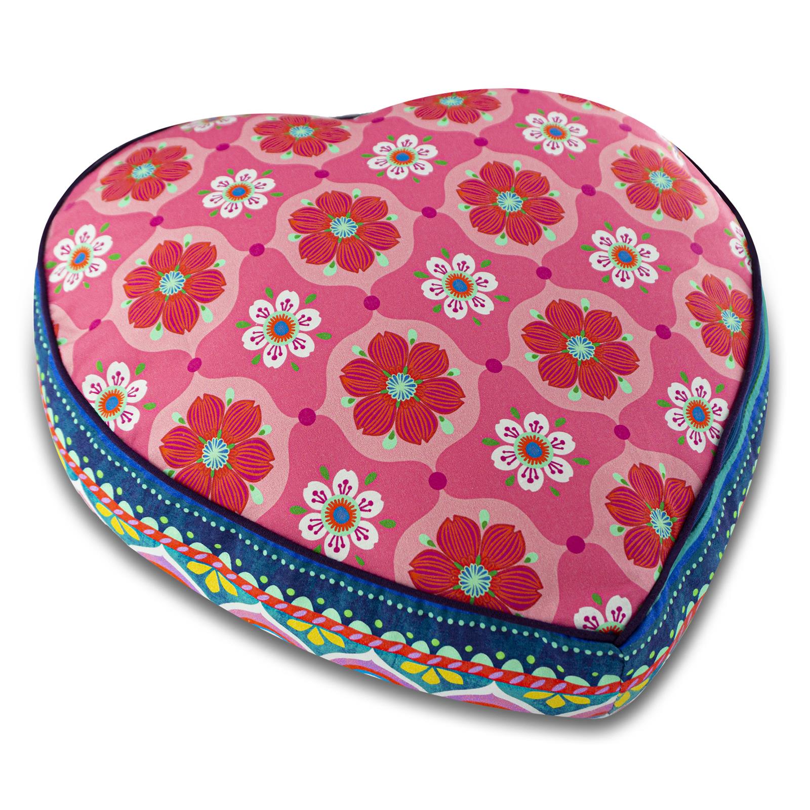 Das mit sehr viel Liebe zum Detail gestaltete große grüne Herzkissenmotiv wurde mit dem „Rosa Retro Blumen“ Stoff auf der Rückseite kombiniert und mit einer hochwertigen lila Biese abgerundet. Da geht einem das Herz auf!
