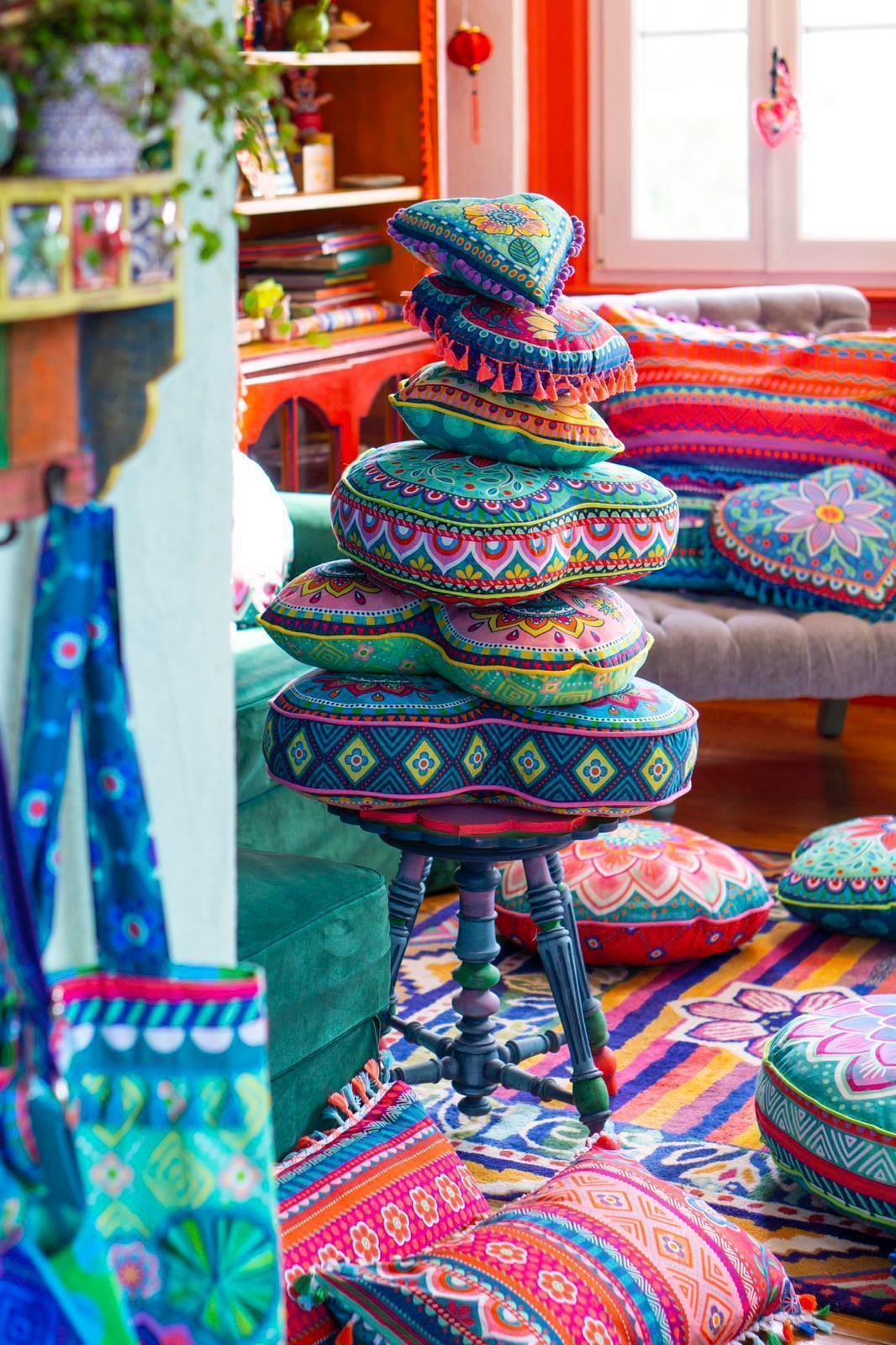 Die Dekokissen sind in unterschiedlichen Größen und Motiven erhältlich, kombiniert mit Biesen, Bommeln/ Pompoms und Quasten im Boho-Style. Dank der unterschiedlichen Rückseiten kann die Ansicht ständig gewechselt werden. Mixen Sie wild durcheinander! Je mehr Farben und Designs, umso besser, denn alles passt zusammen.