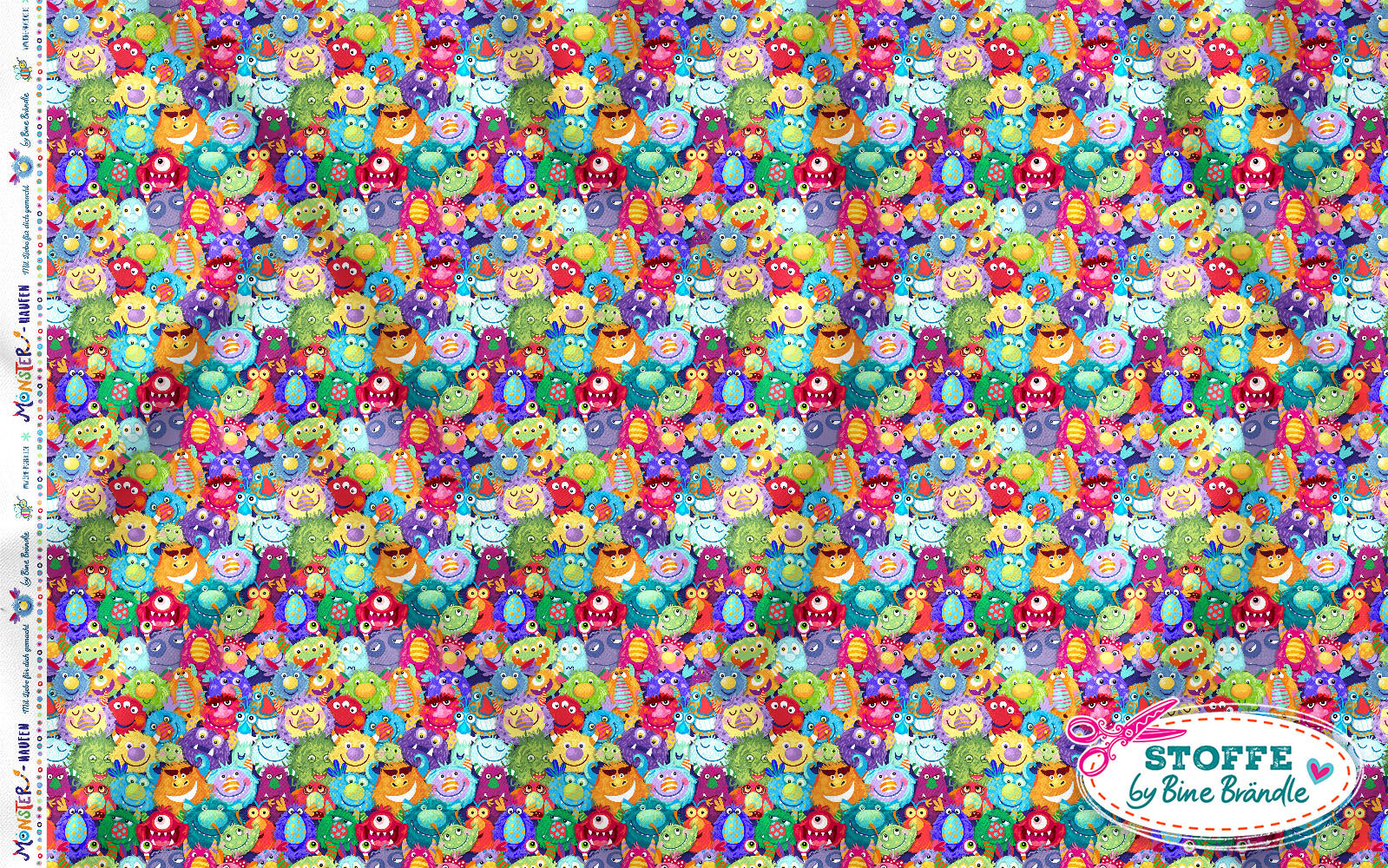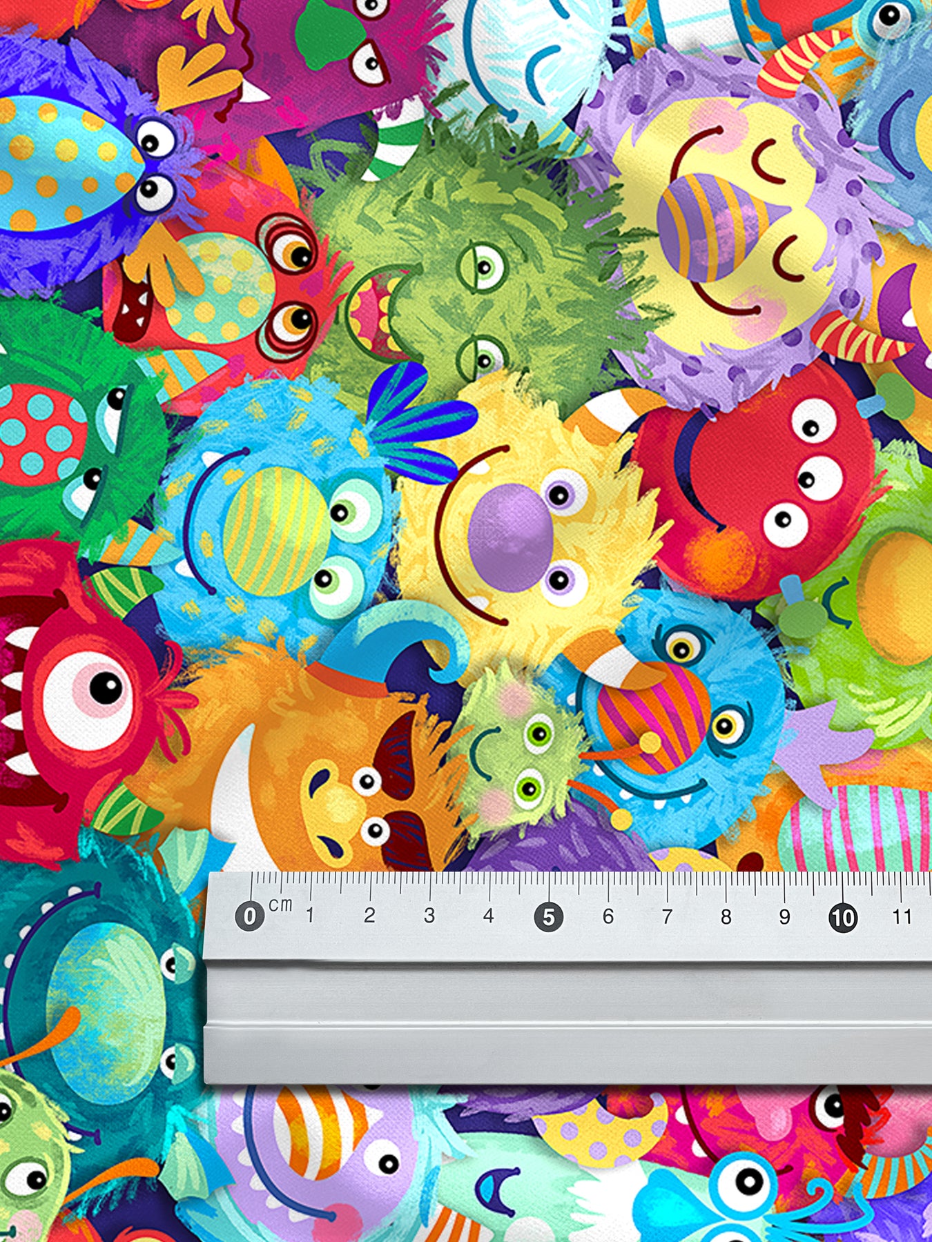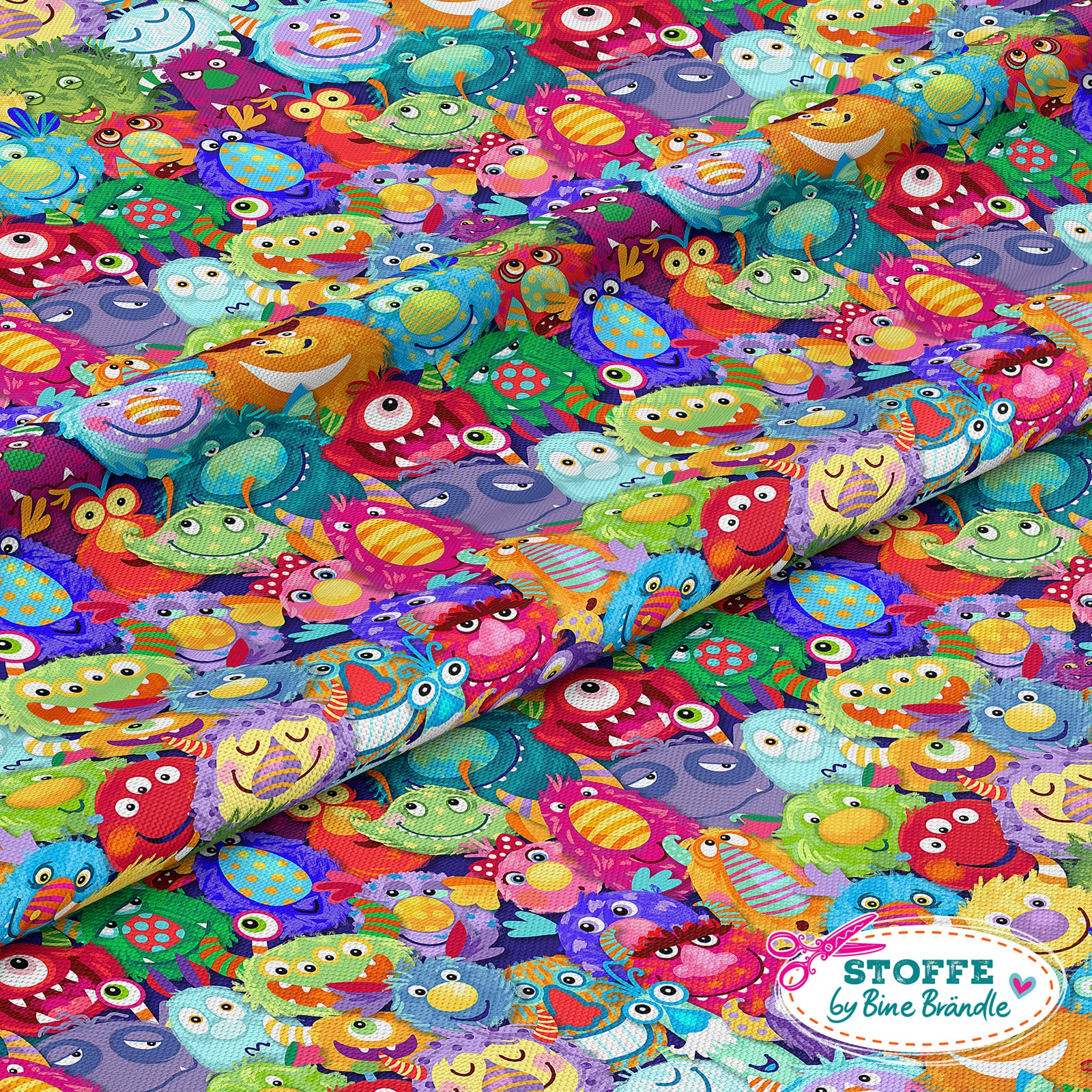 Der Stoff hat das freudige Monster Motiv "Monsterhaufen".