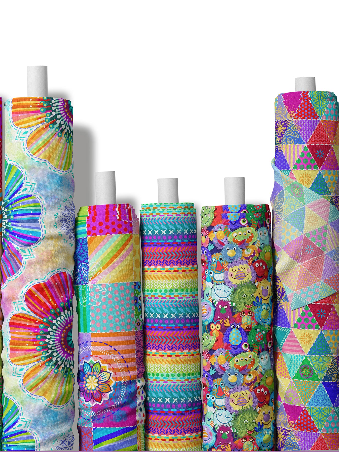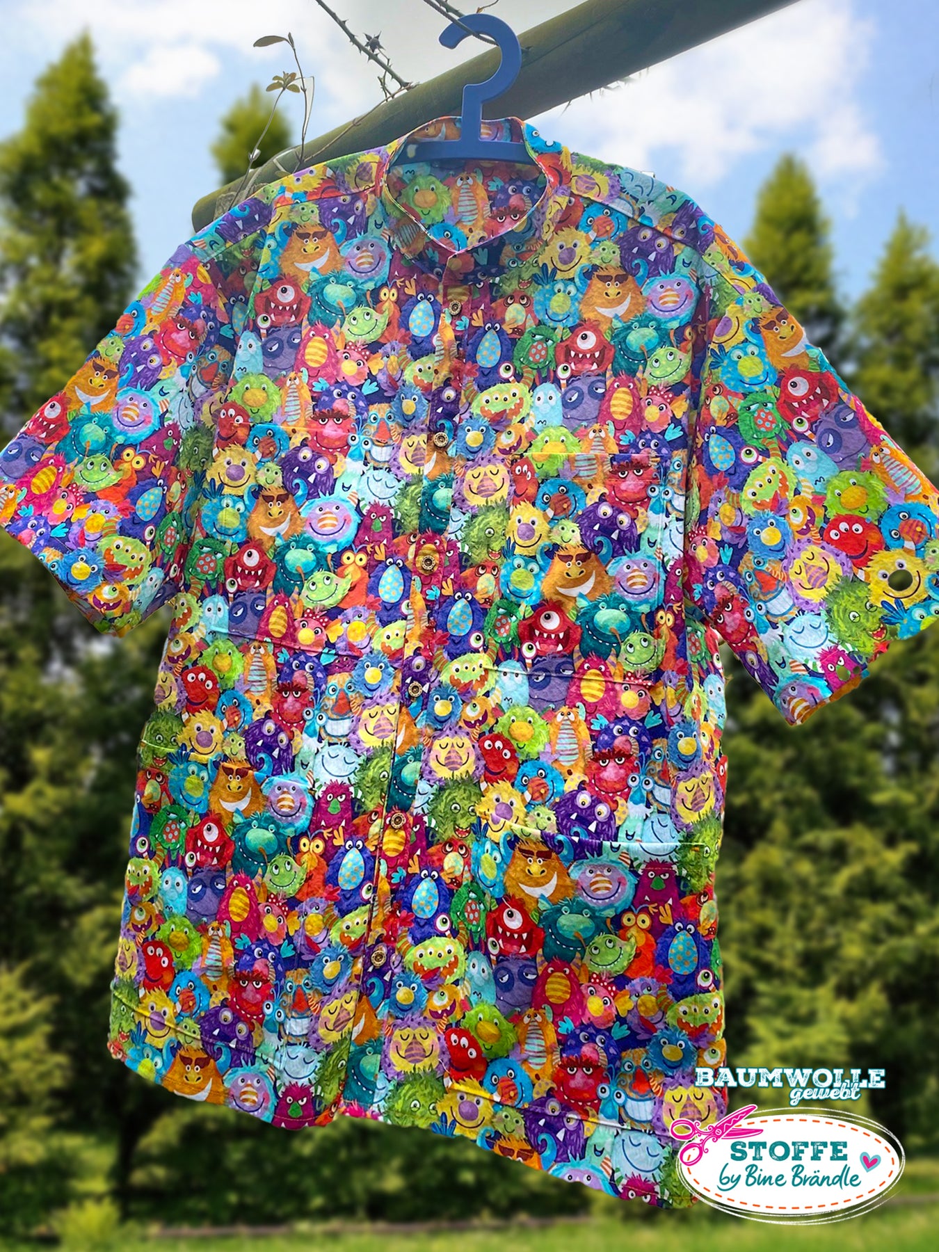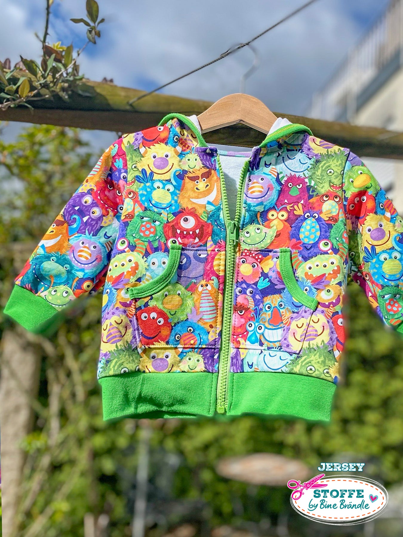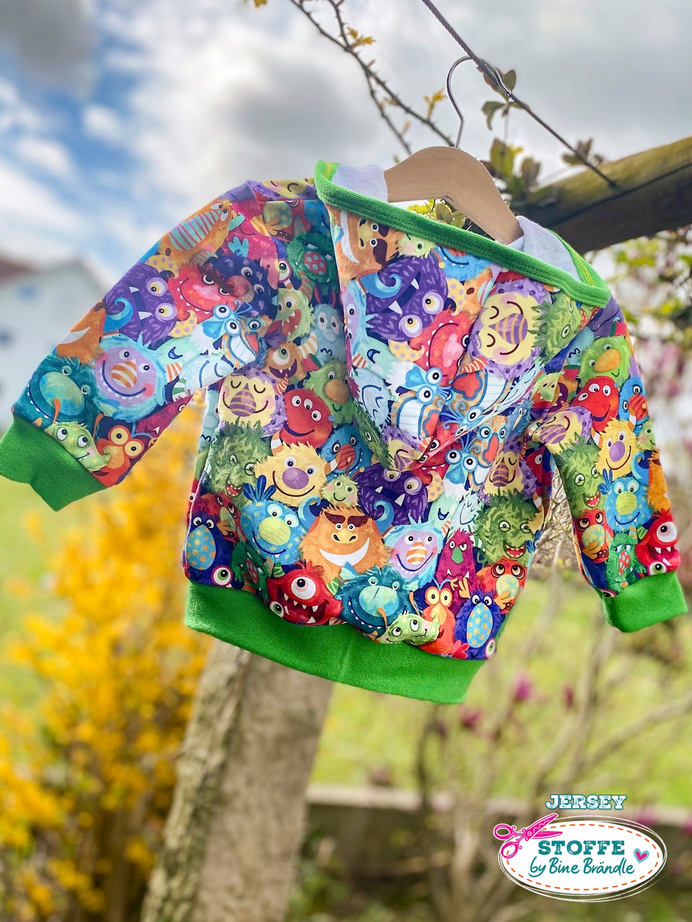 Der Stoff hat das freudige Monster Motiv "Monsterhaufen".