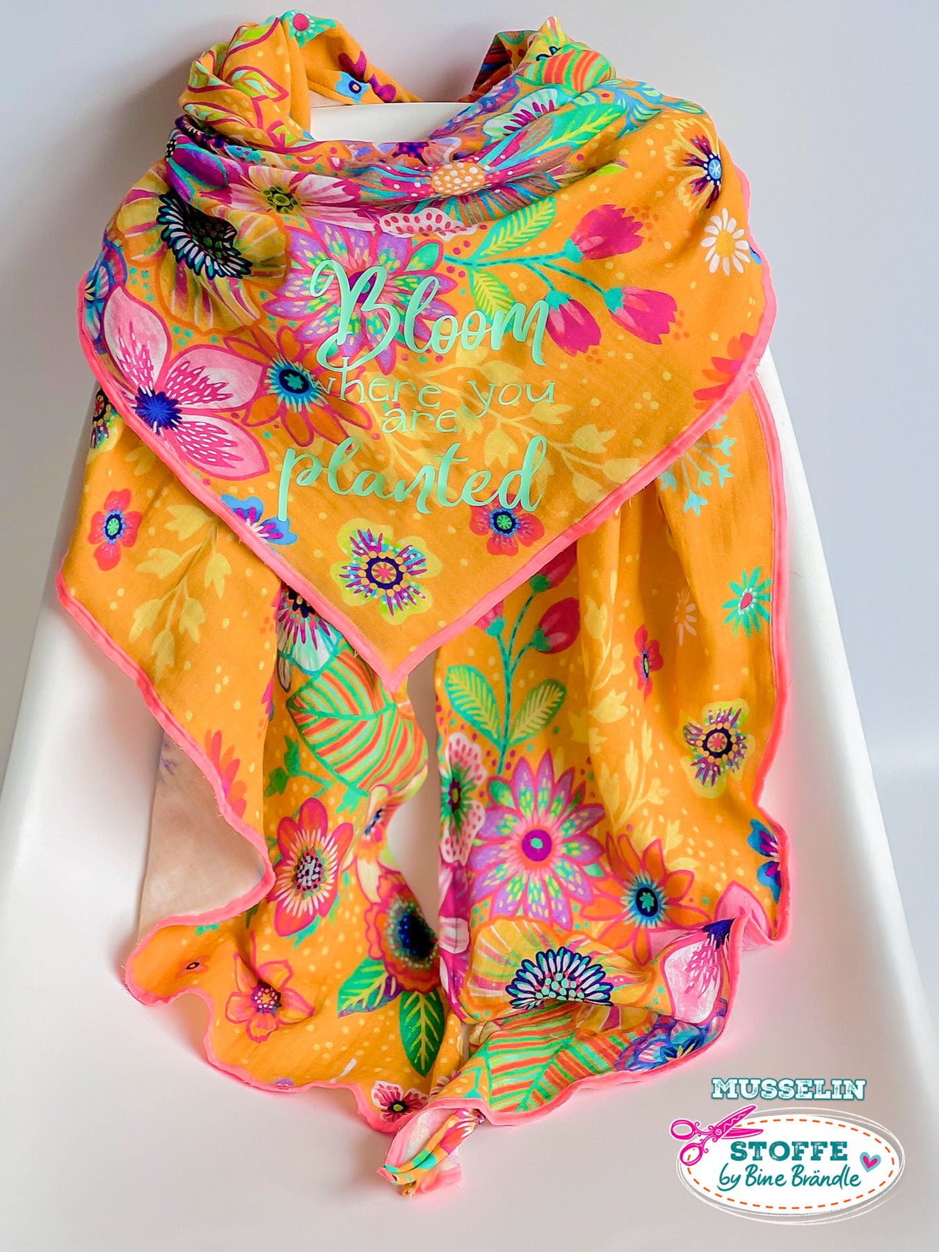 Wunderschöne Blüten in unterschiedlich große, von ca 3 cm bis ca 15 cm, arrangiert mit Blättern, die als Blütenregen von oben nach unten fallen und sich im unteren Teil des Designs als Blumenmeer sammeln. Alles hingelegt mit einem strahlenden Gelb.