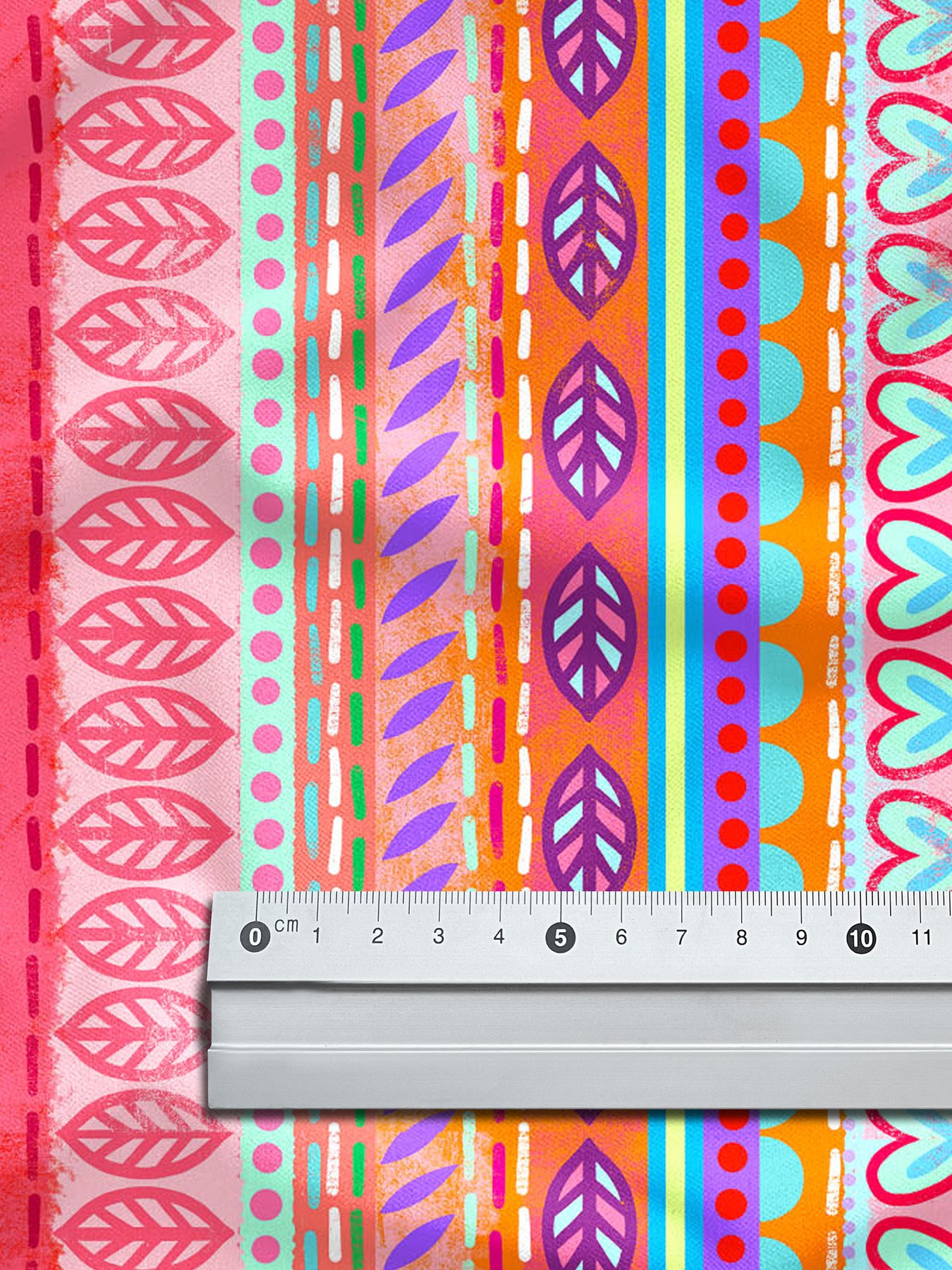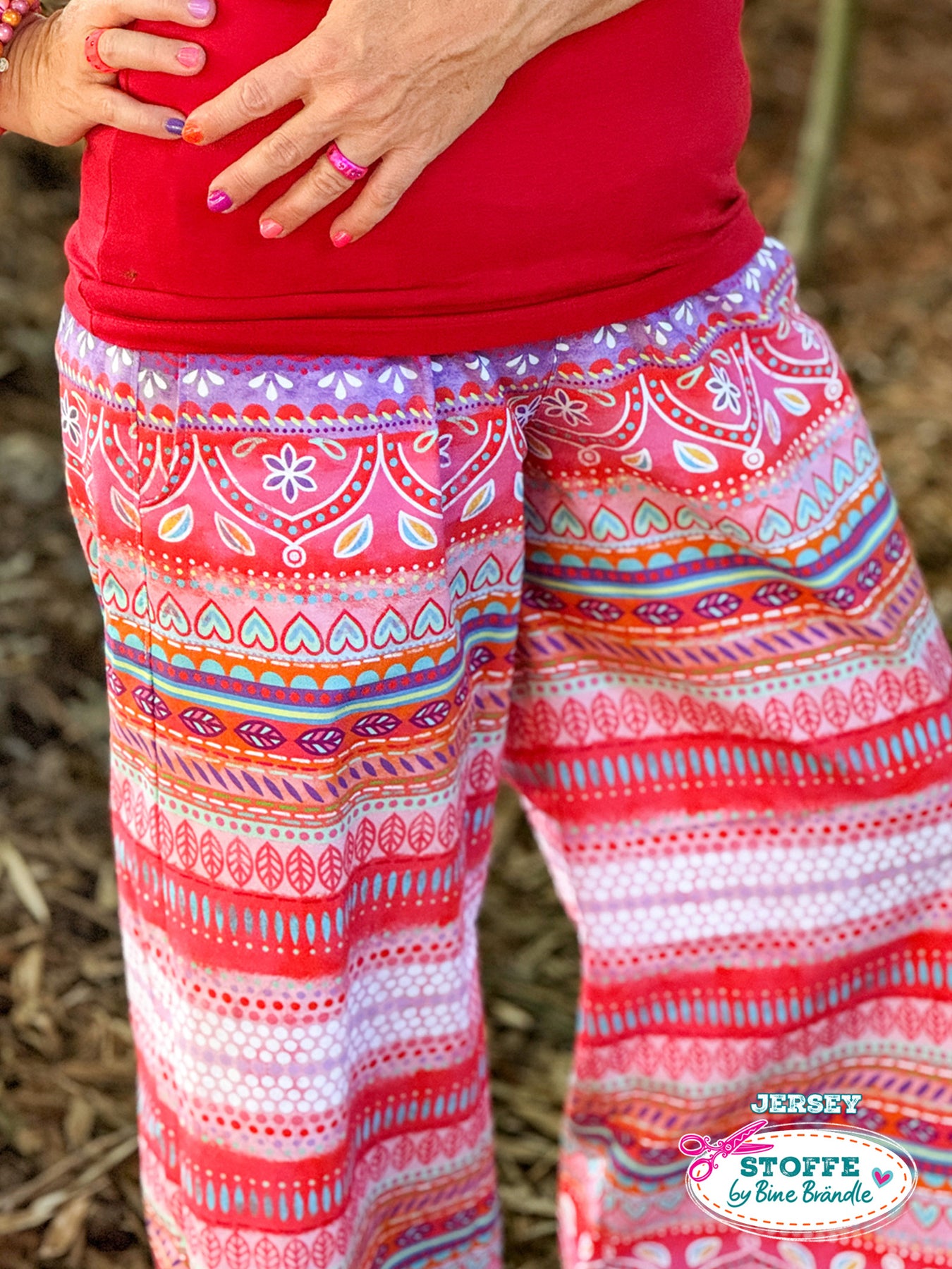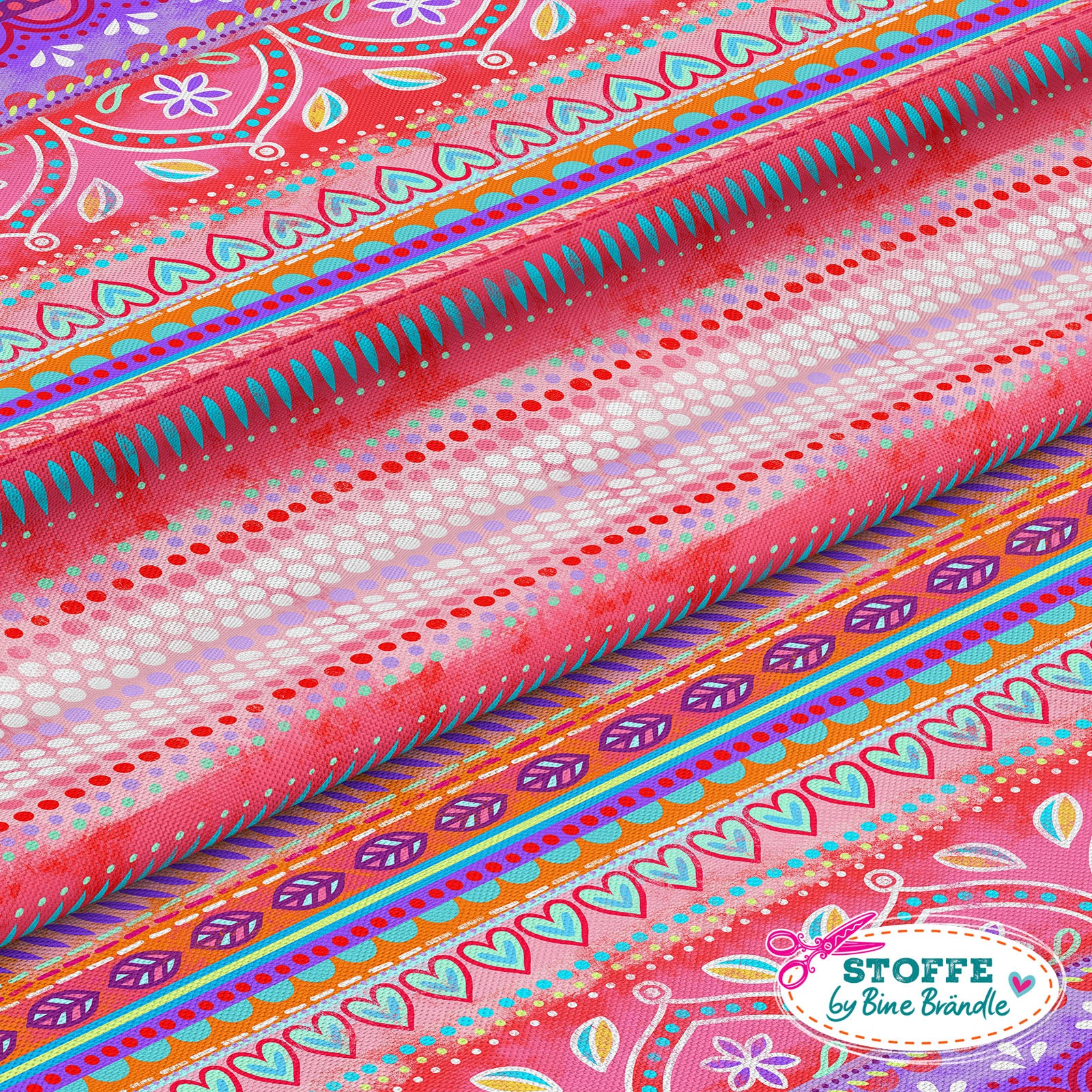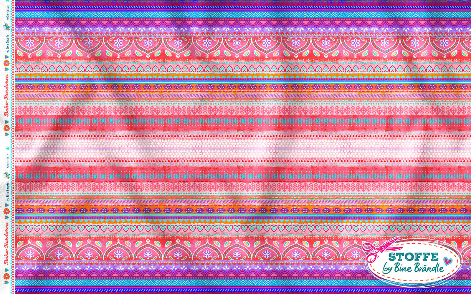 Farbenfroher Stoff mit dem Motiv "Boho-Bordüren rot".