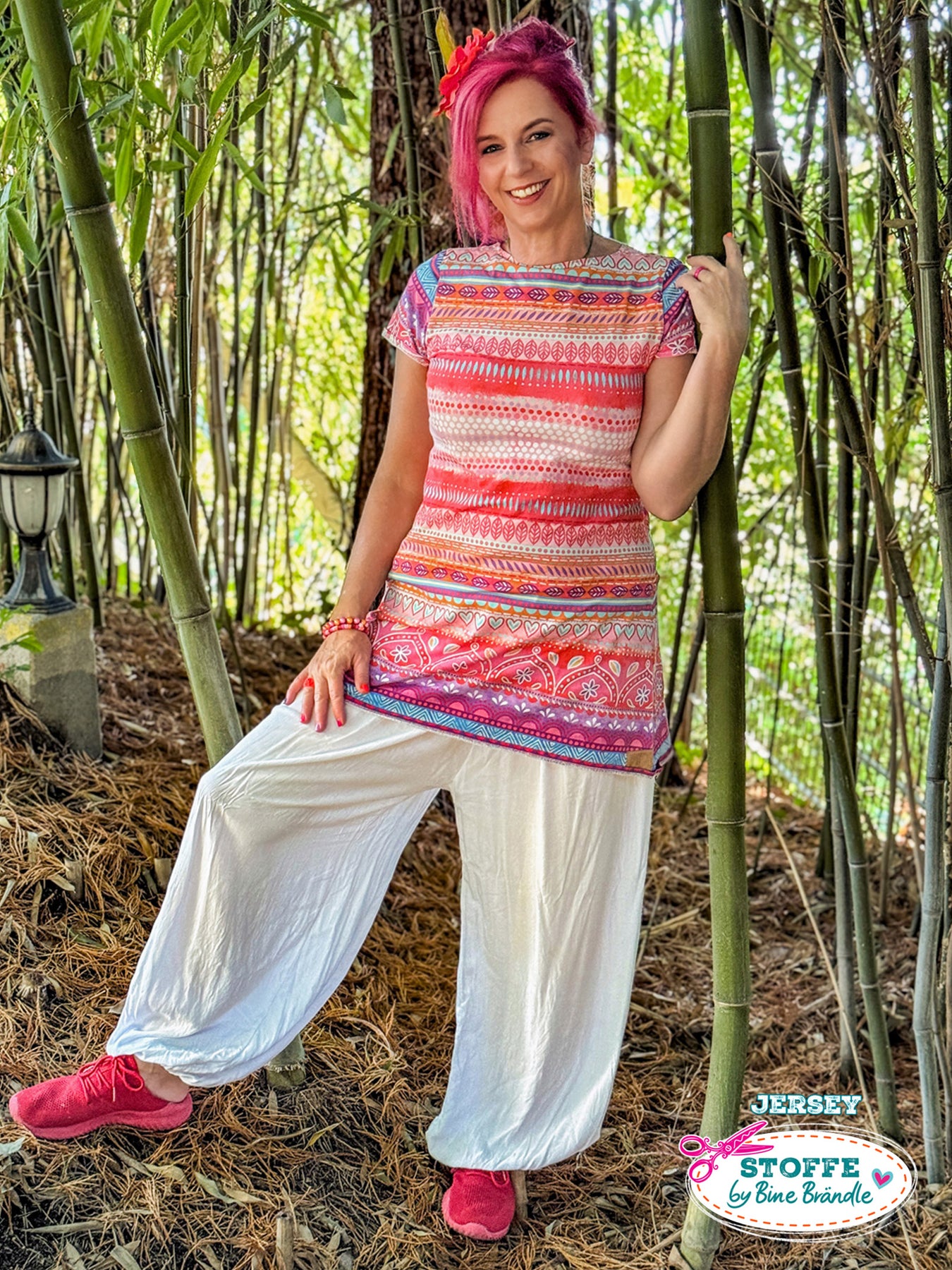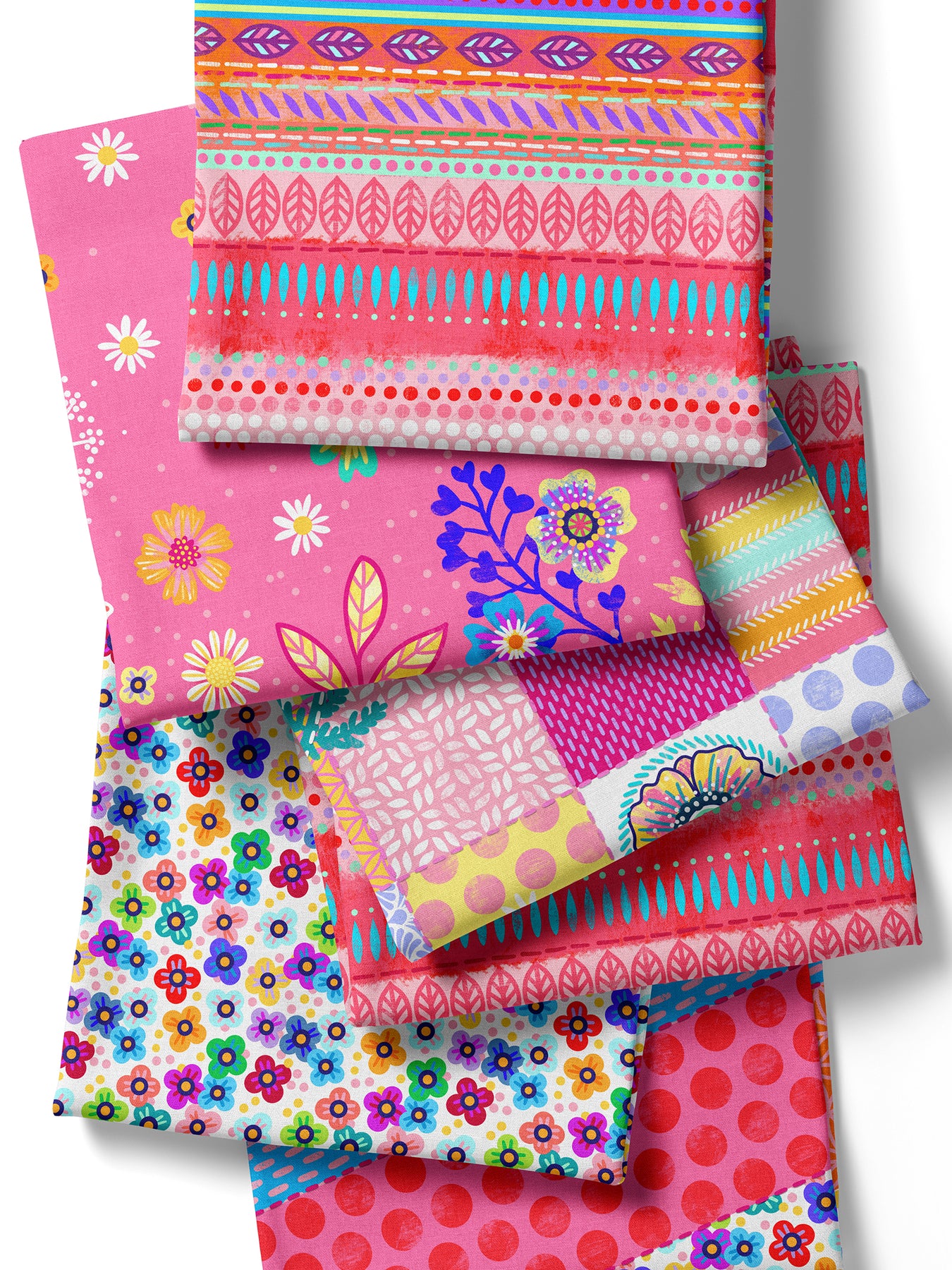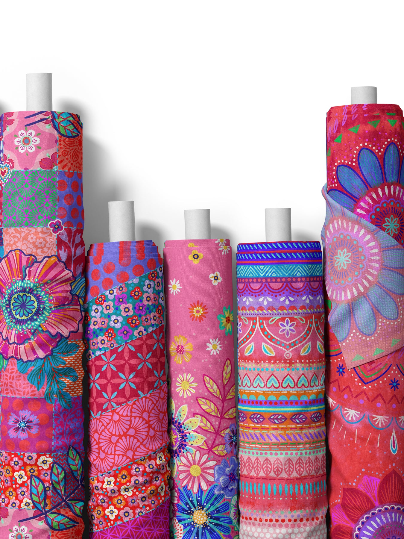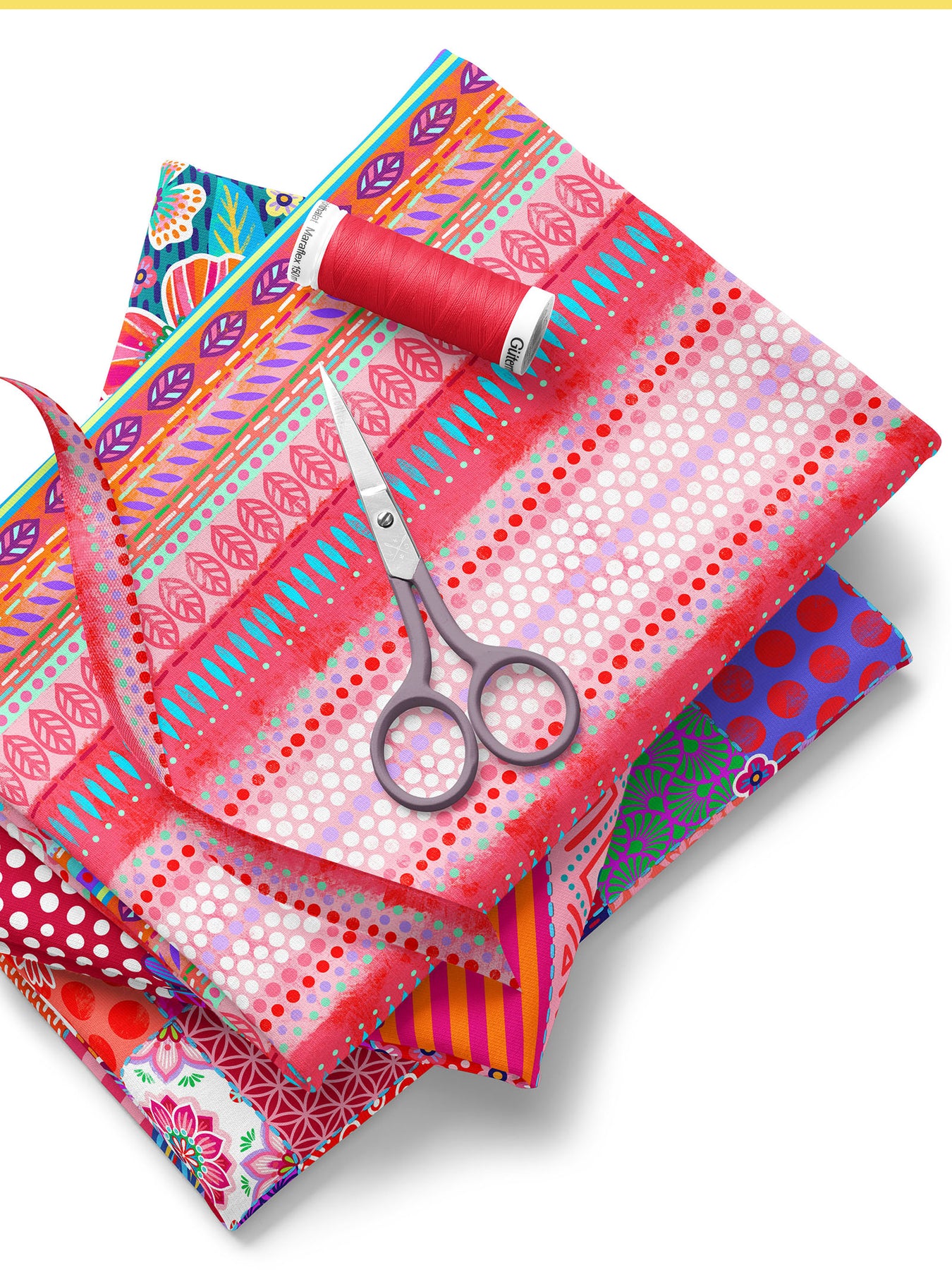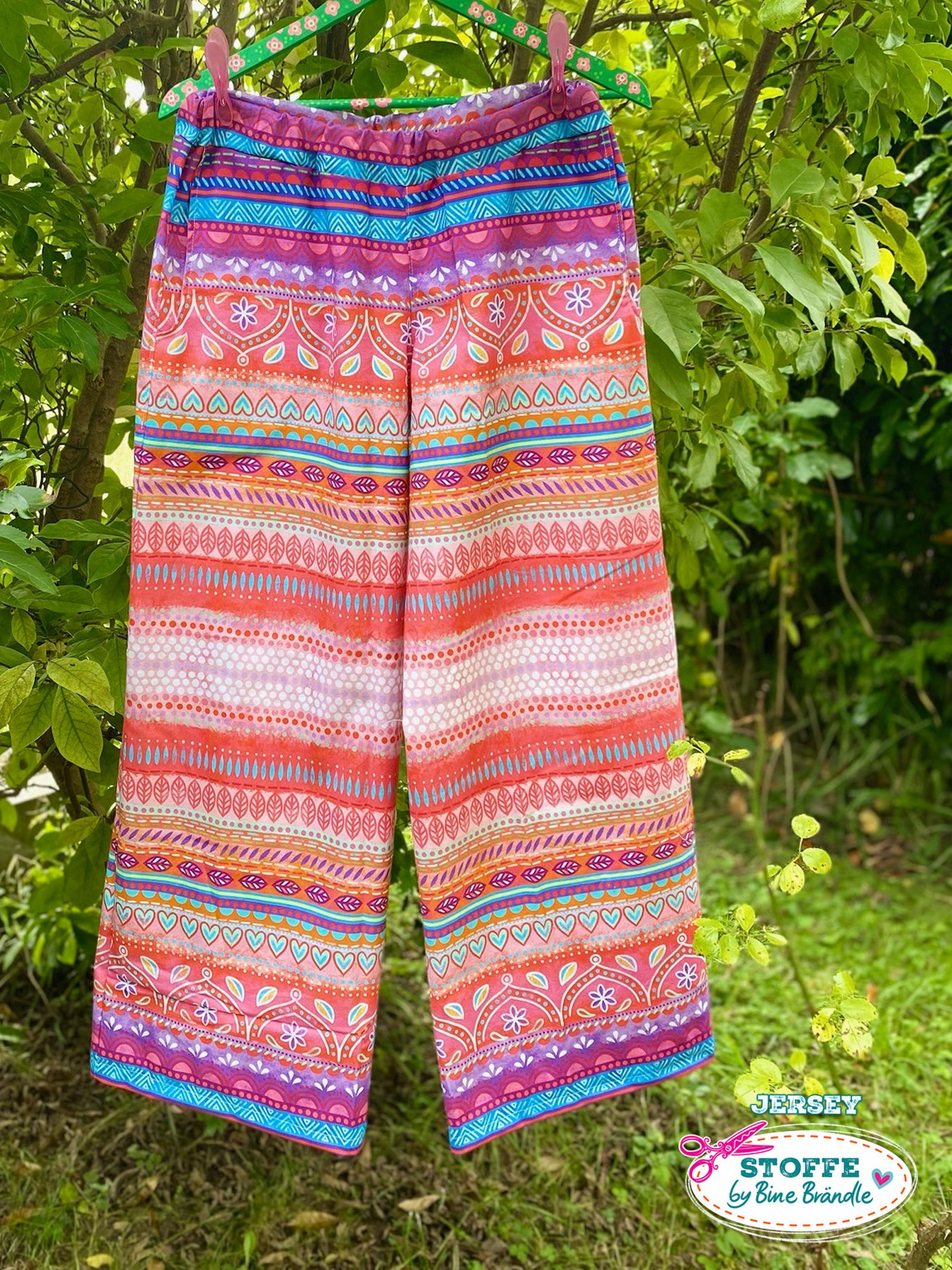 Farbenfroher Stoff mit dem Motiv "Boho-Bordüren rot".
