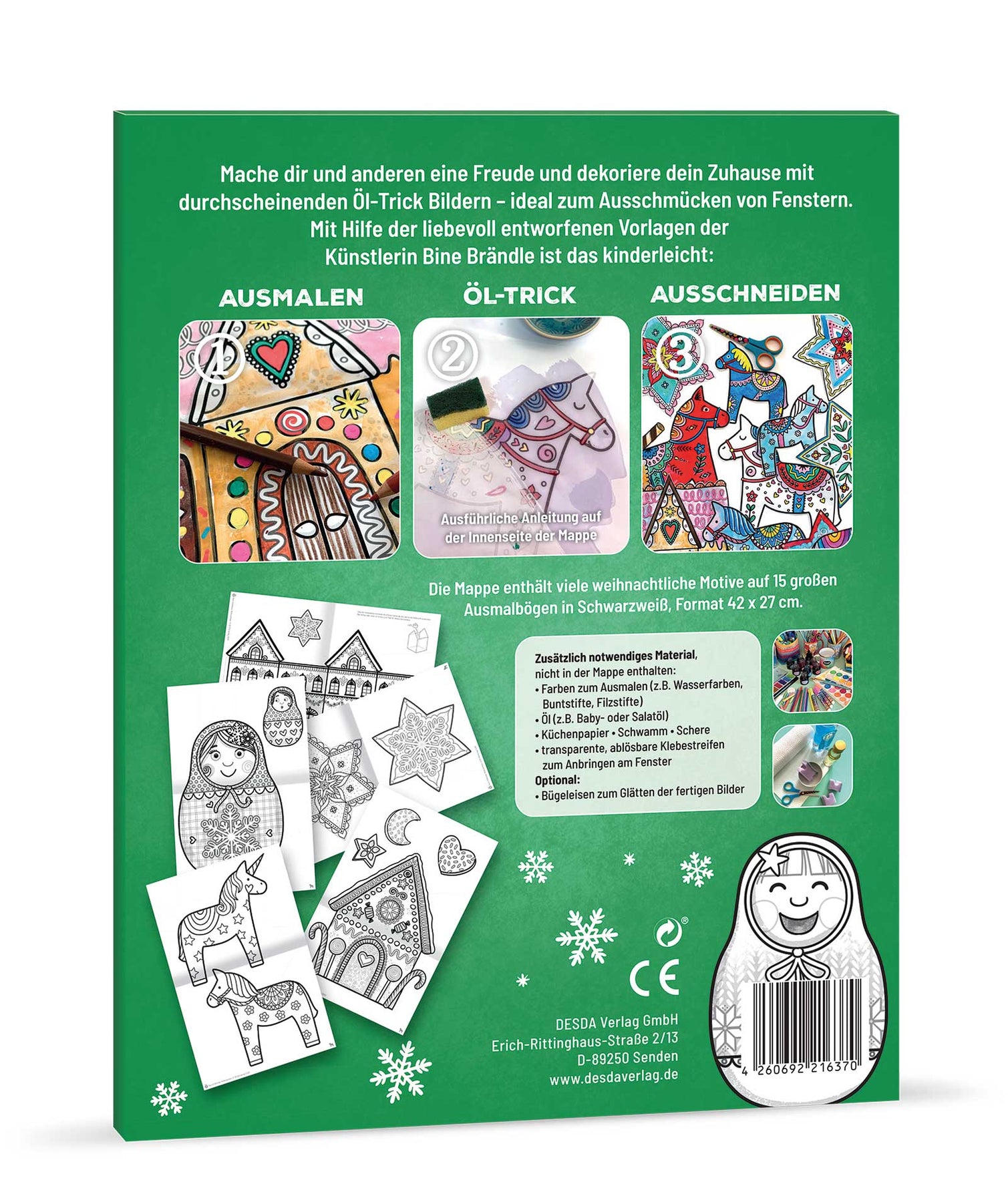 Die Mappe enthält viele weihnachtlichen Motive auf 15 große Ausmalbögen in Schwarzweiß, Format 42 x 27 cm.