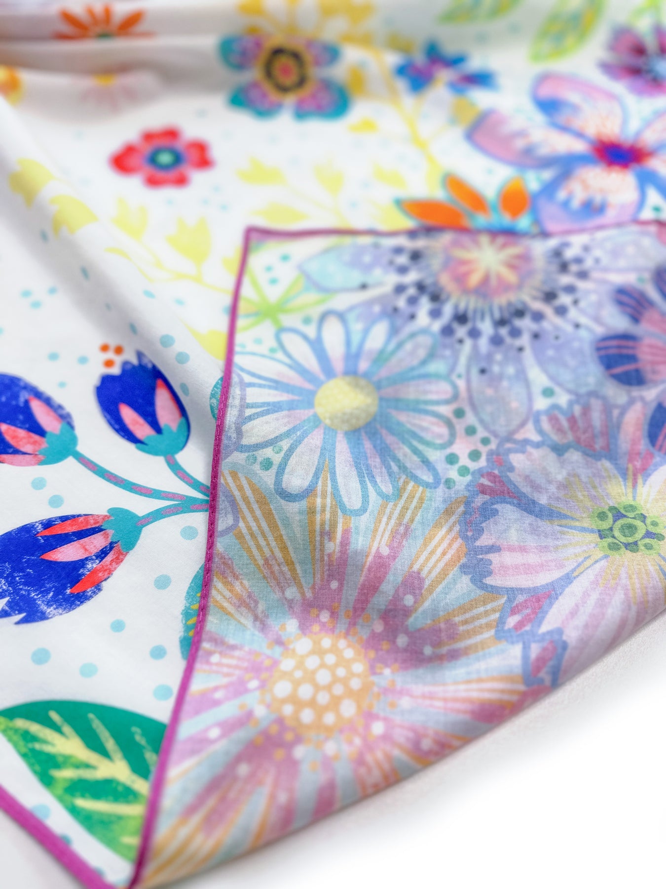 Der einseitige Druck sorgt dafür, dass die Rückseite etwas pastelliger wirkt – so entsteht ein wunderschöner, sanfter Farbverlauf, der das Tuch noch lebendiger macht.